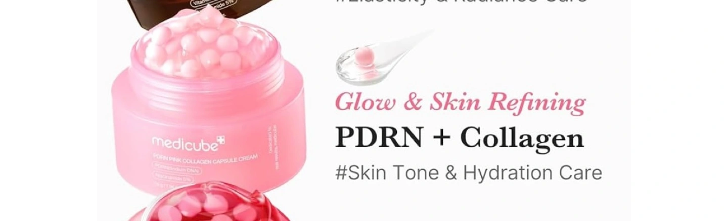 104I'm selling a Medicube PDRN Pink Collagen Capsule Cream. This cream is designed to improve uneven skin tone and boost radiance for sagging and dull skin. It features an innovative capsule formula and a lightweight, non-sticky texture. Key ingredients include Salmon DNA PDRN, Collagen & Hyaluronic acid, and Niacinamide. It comes in a 55 g / 1.94 oz size