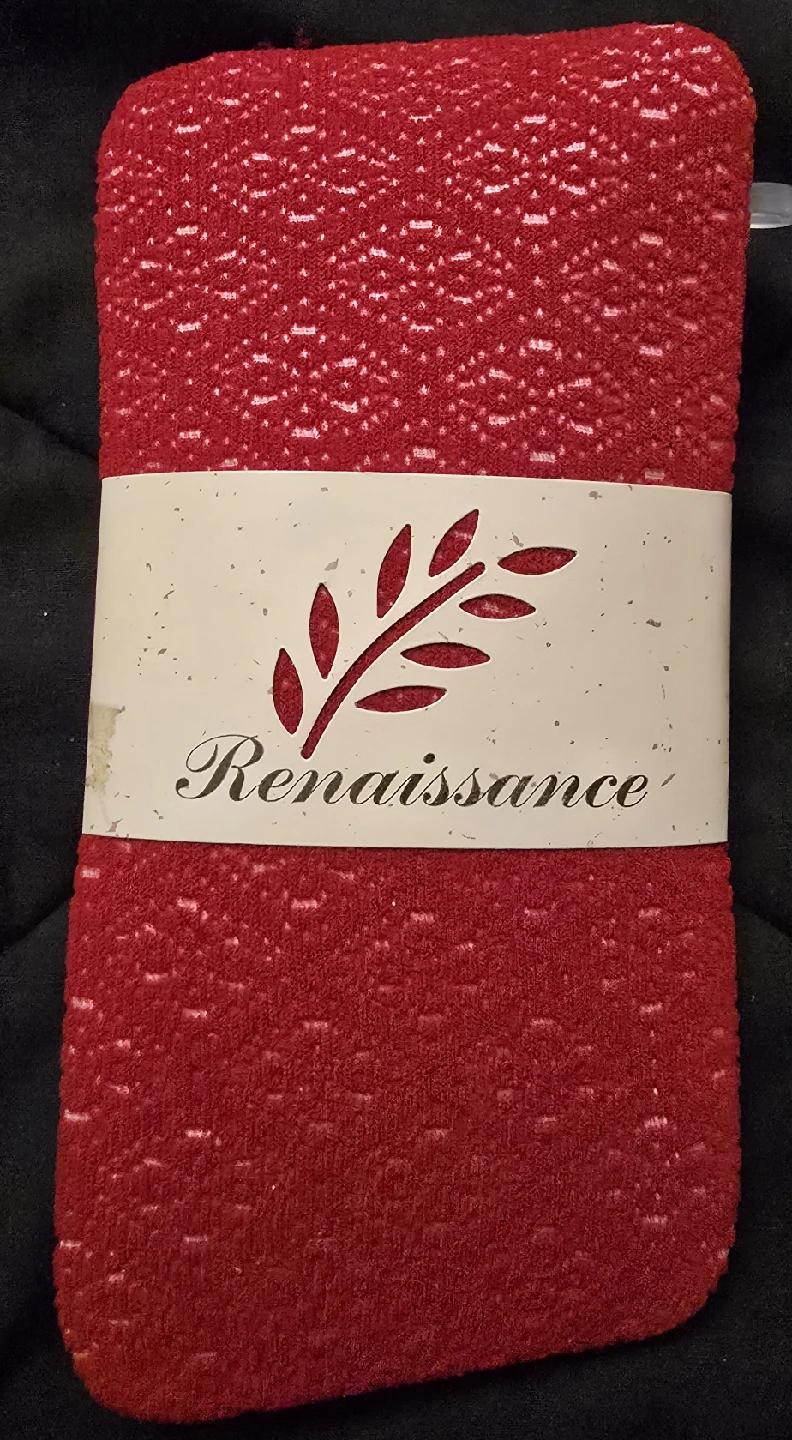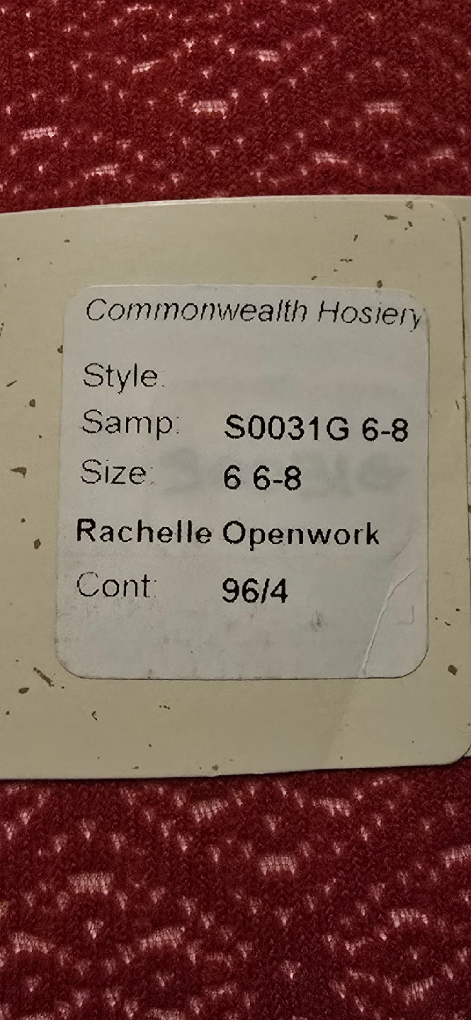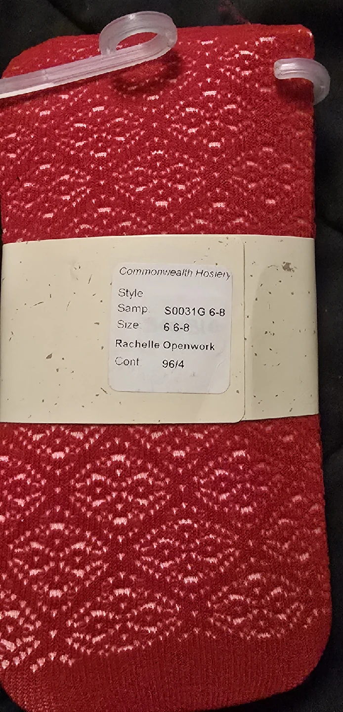 Selling a pair of Renaissance brand tights in a vibrant red colour! The size is 6-8, and they feature a 'Rachelle Openwork' style from Commonwealth Hosiery. Perfect for adding a pop of colour to any outfit, Especially around Christmas!