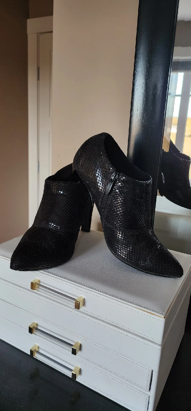 Selling a pair of stylish black pointed-toe heeled booties. They have a unique snakeskin-like texture. Perfect for adding a touch of sophistication to any outfit!
