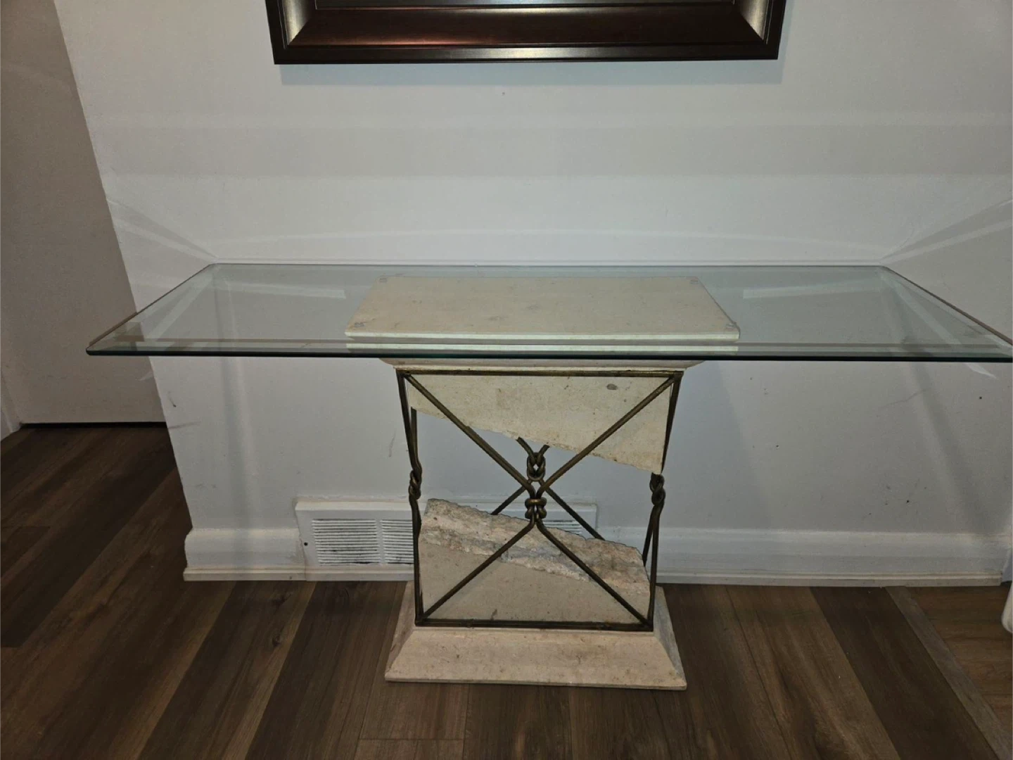 Selling a set of 2 glass top accent tables It features a unique base design. Perfect for adding a touch of elegance to any room!, ine if them has a chip at the bottom that can be easily repair.