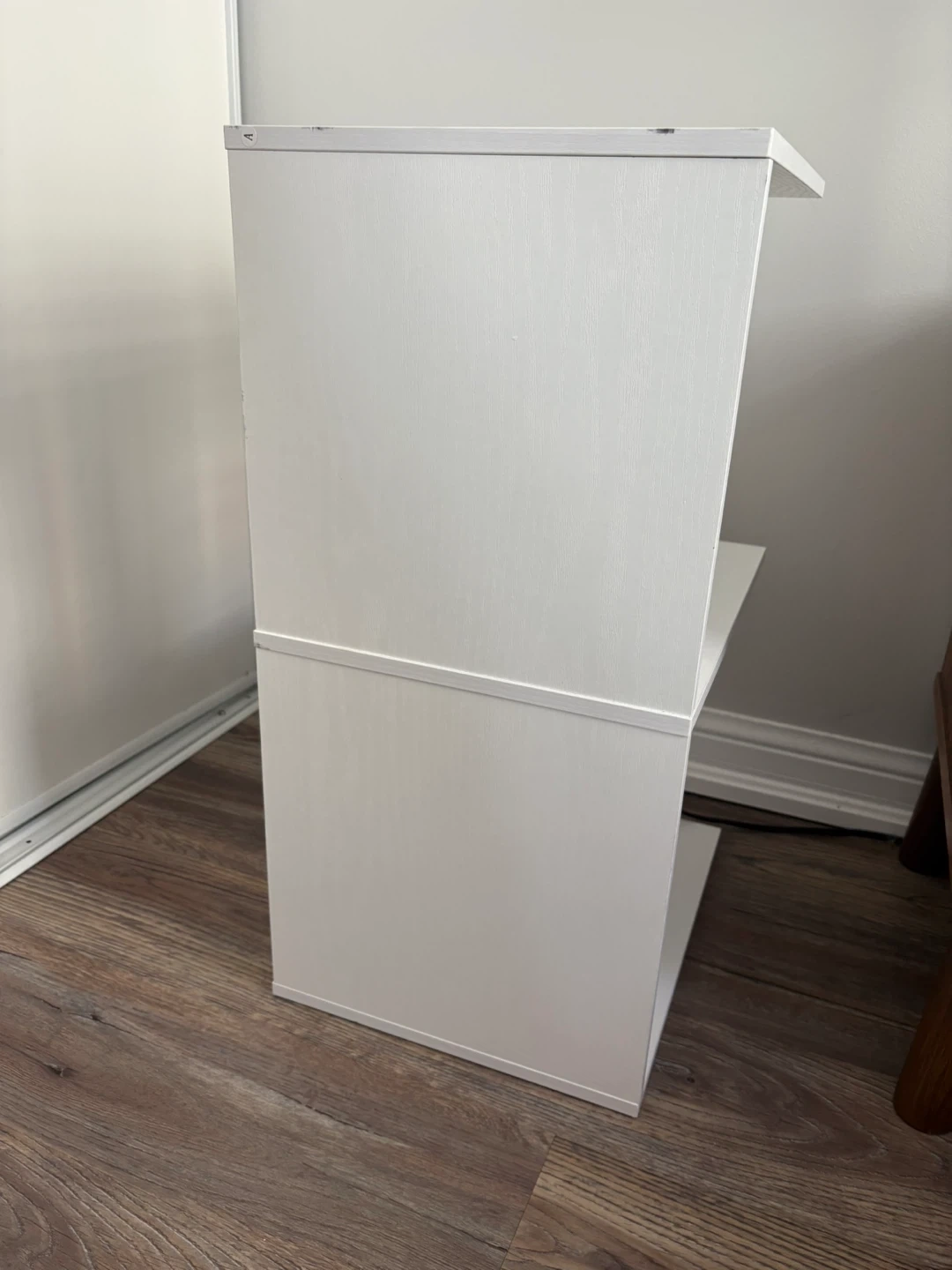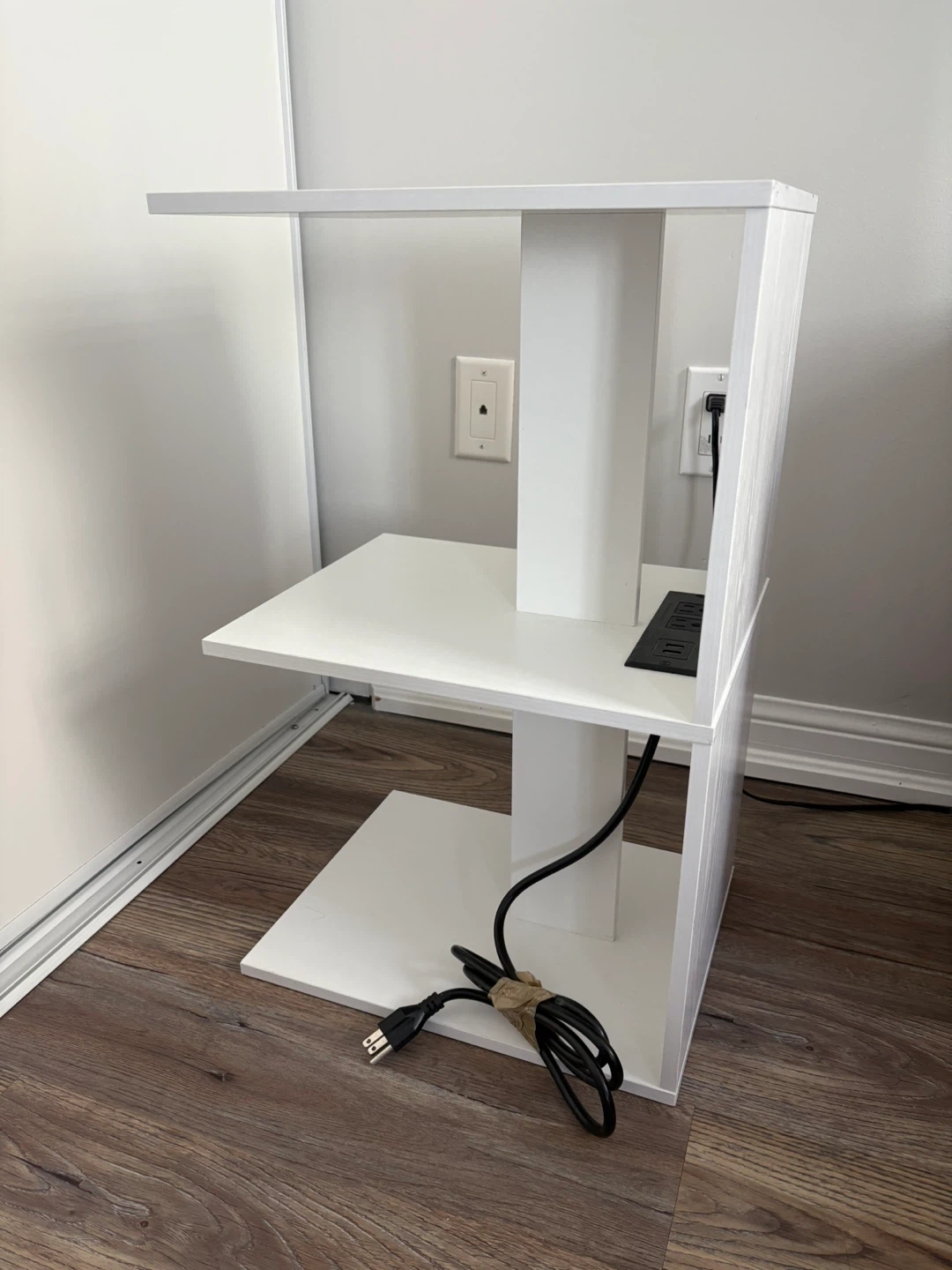 87Selling a simple white end table! It has two shelves for storage and a built-in USB port for charging your devices. Great for a bedside table or living room accent piece. Asking $25