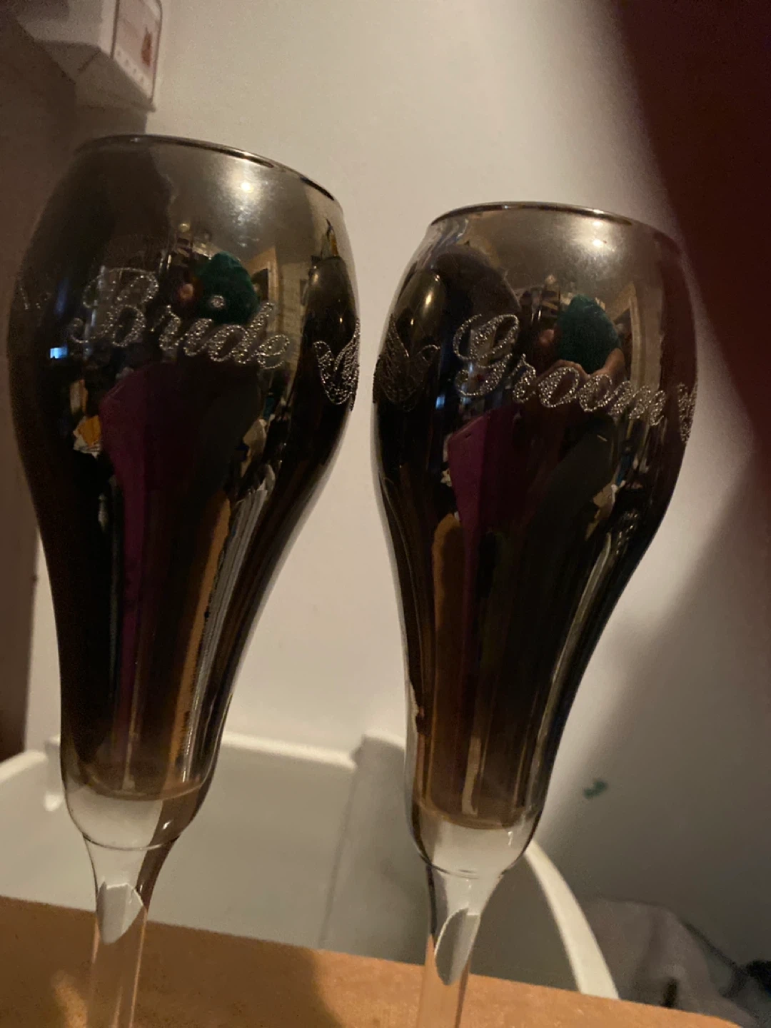 Selling a set of champagne flutes perfect for a wedding! One is labelled 'Bride' and the other 'Groom'. They're in great shape and ready to celebrate a special occasion