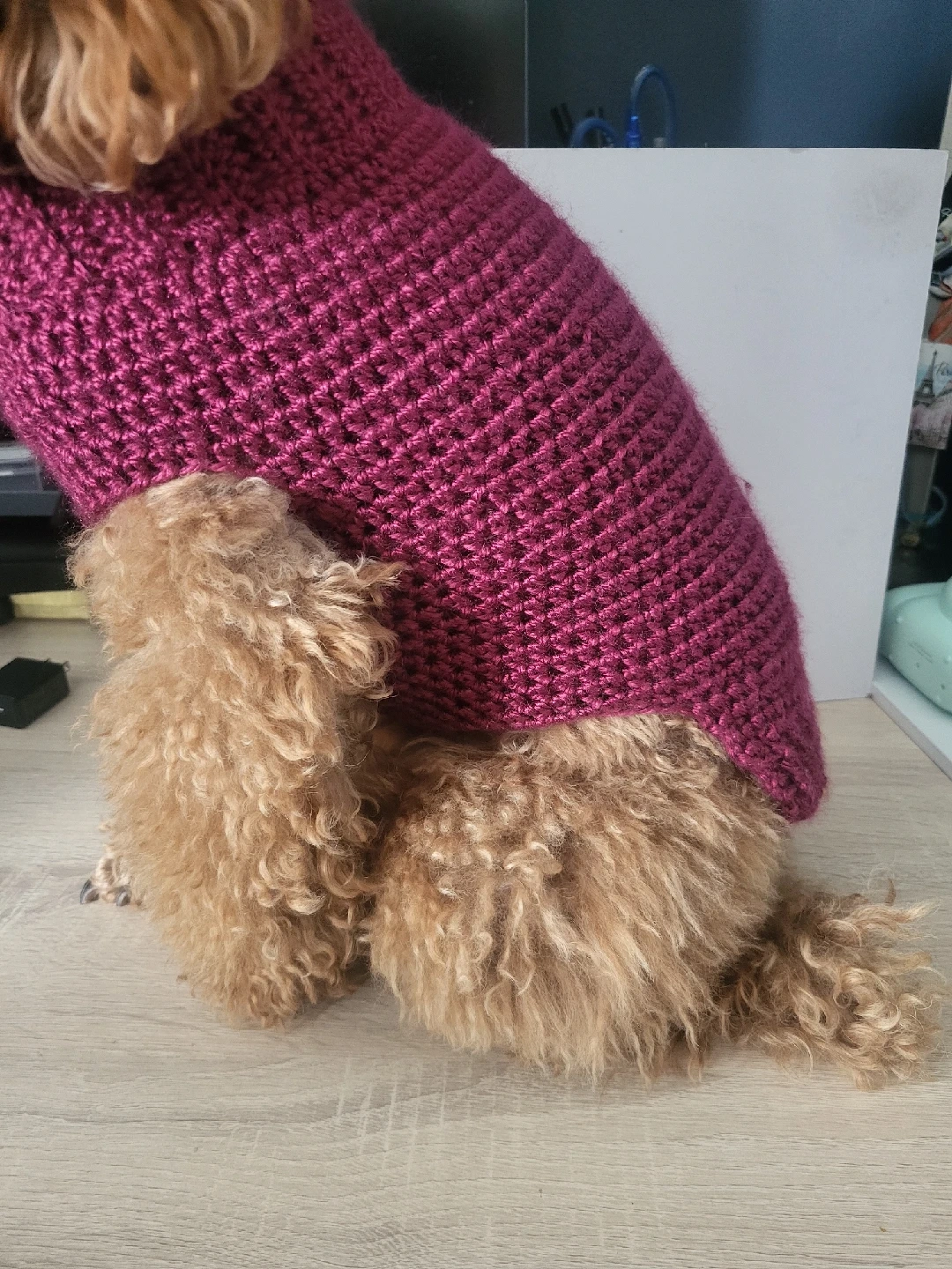 A cute burgundy dog sweater, perfect for keeping your furry friend warm during the colder months! It's a cozy, hand-knitted piece that's sure to make your pup look adorable