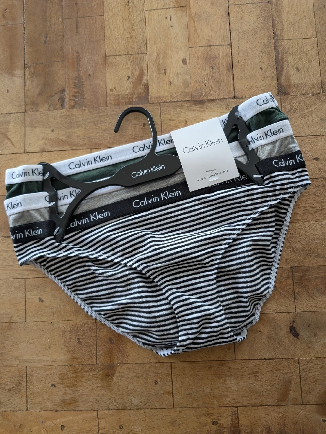 Brand new 3-pack of Calvin Klein undies. A mix of colours and patterns: Green, grey and black and white stripes. Retails for $68.00.