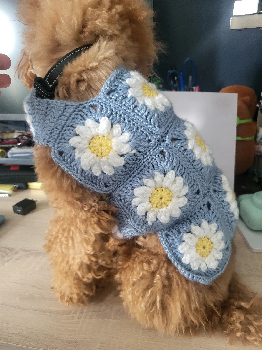 This adorable handmade crochet dog sweater is perfect for keeping your furry friend warm and stylish! It features a lovely blue colour with cute daisy accents. It's in great condition and ready for a new home. Perfect for small to medium sized dogs