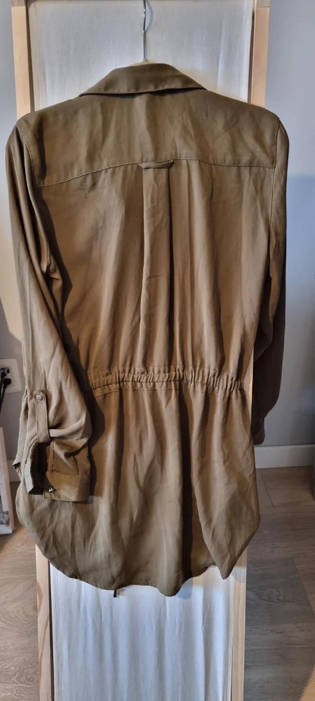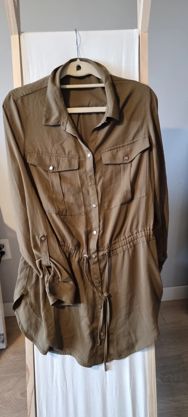 Selling a cute Dynamite shirt dress in olive green! It's a size small and features a drawstring waist for a flattering fit. Perfect for a casual day out or dressed up with some heels. It has a button-down front and two chest pockets.