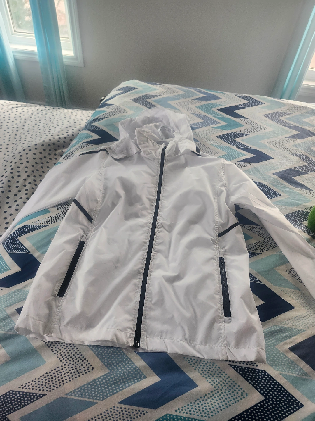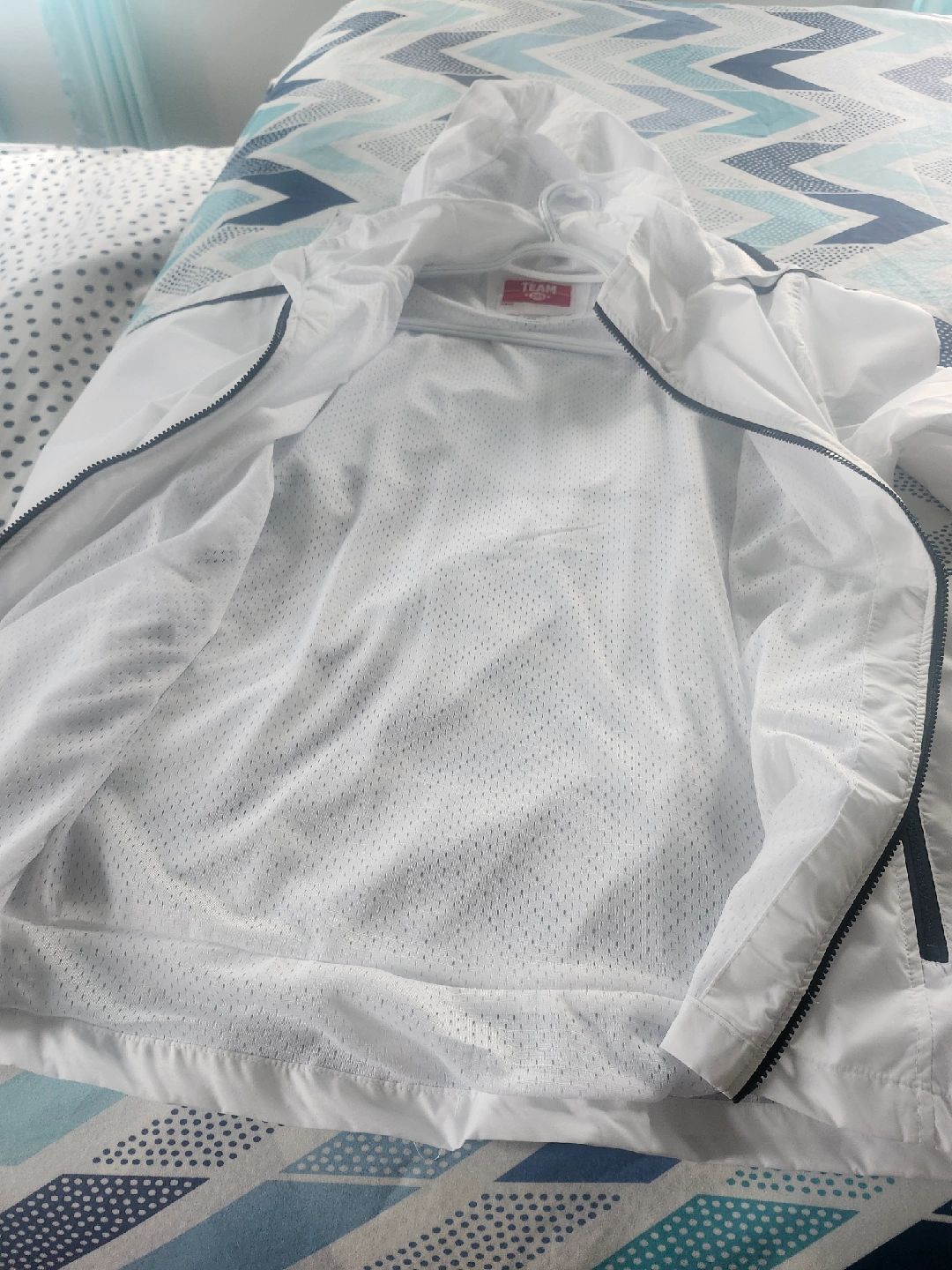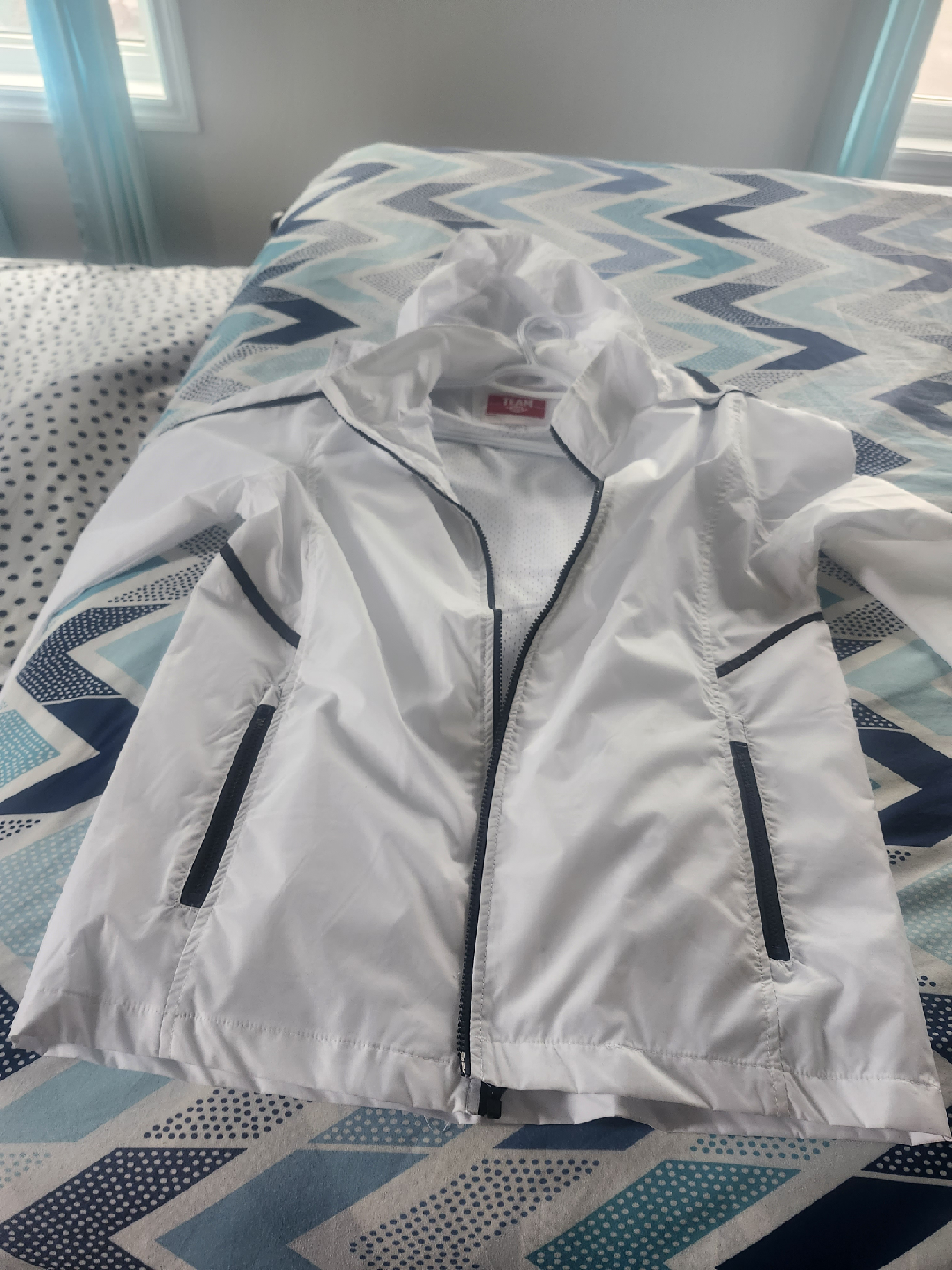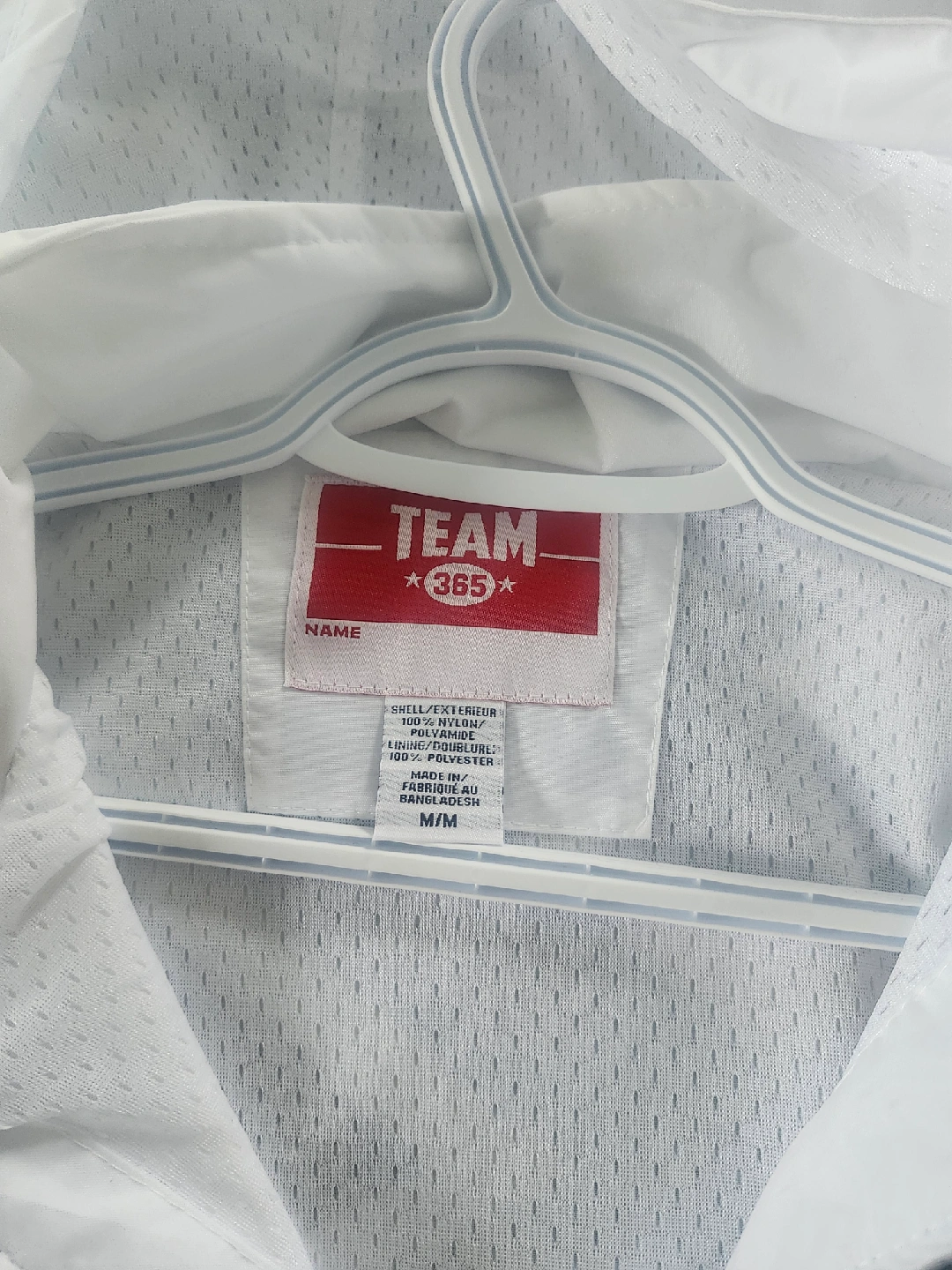 Selling a Team 365 windbreaker jacket in white. It's in great condition and perfect for layering on those breezy days! The size is M/M, and it's made of 100% nylon for the shell.never use