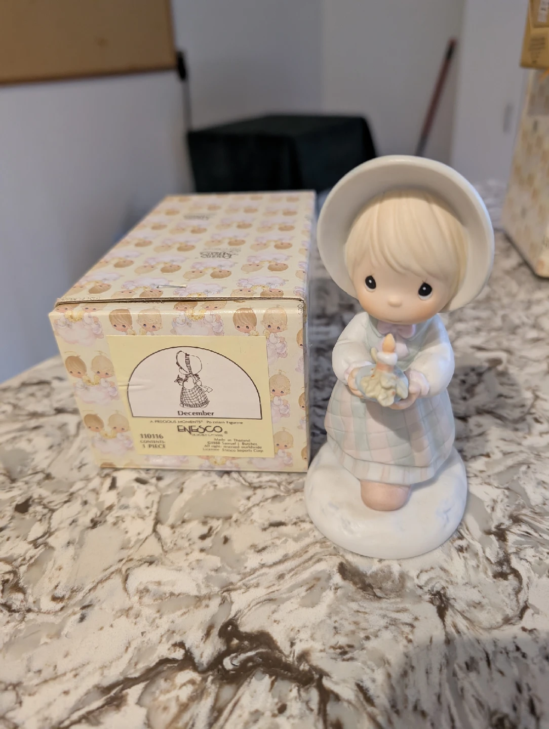 Selling a cute Precious Moments figurine, titled "December". It's a porcelain figurine from Enesco. Comes with the original box!