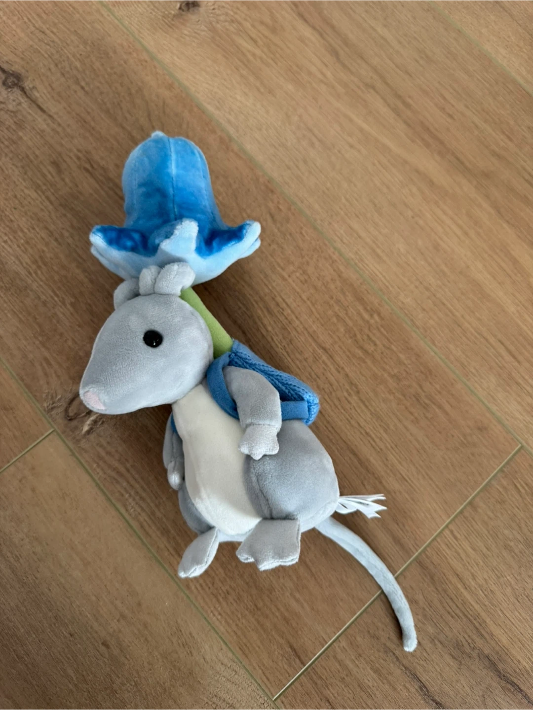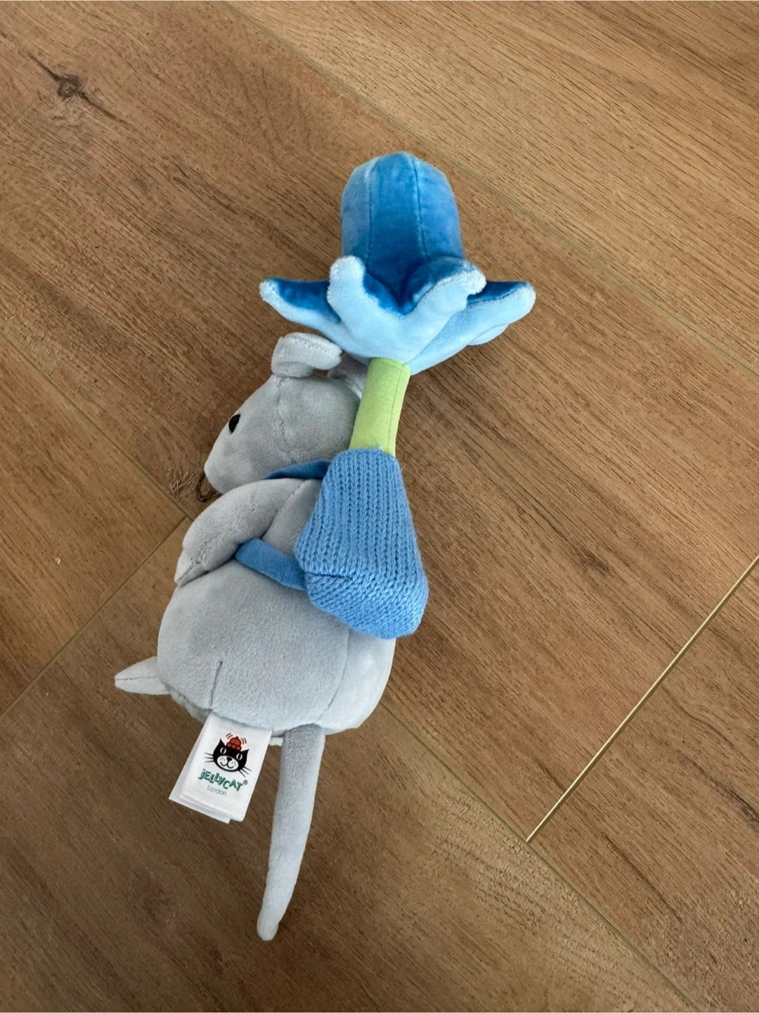 Selling a super cute Jellycat plush! It's a sweet little gray mouse carrying a bright blue flower. The mouse is in great condition and ready for a new home. It's so soft and cuddly!