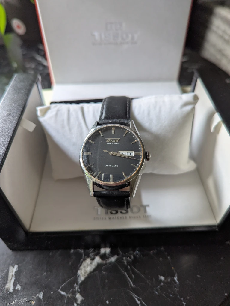 This is an older but very popular watch in the Tissot line for men. It has a black leather adjustable band .