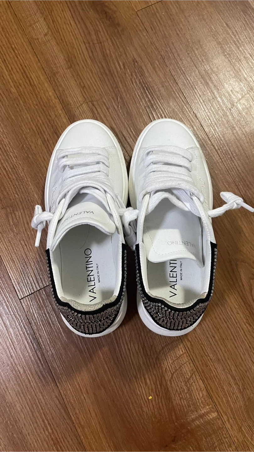 Selling a pair of Valentino white leather sneakers. These stylish sneakers feature a unique design with embellishments on the back. They are in great condition and ready for a new home! (Authentic)