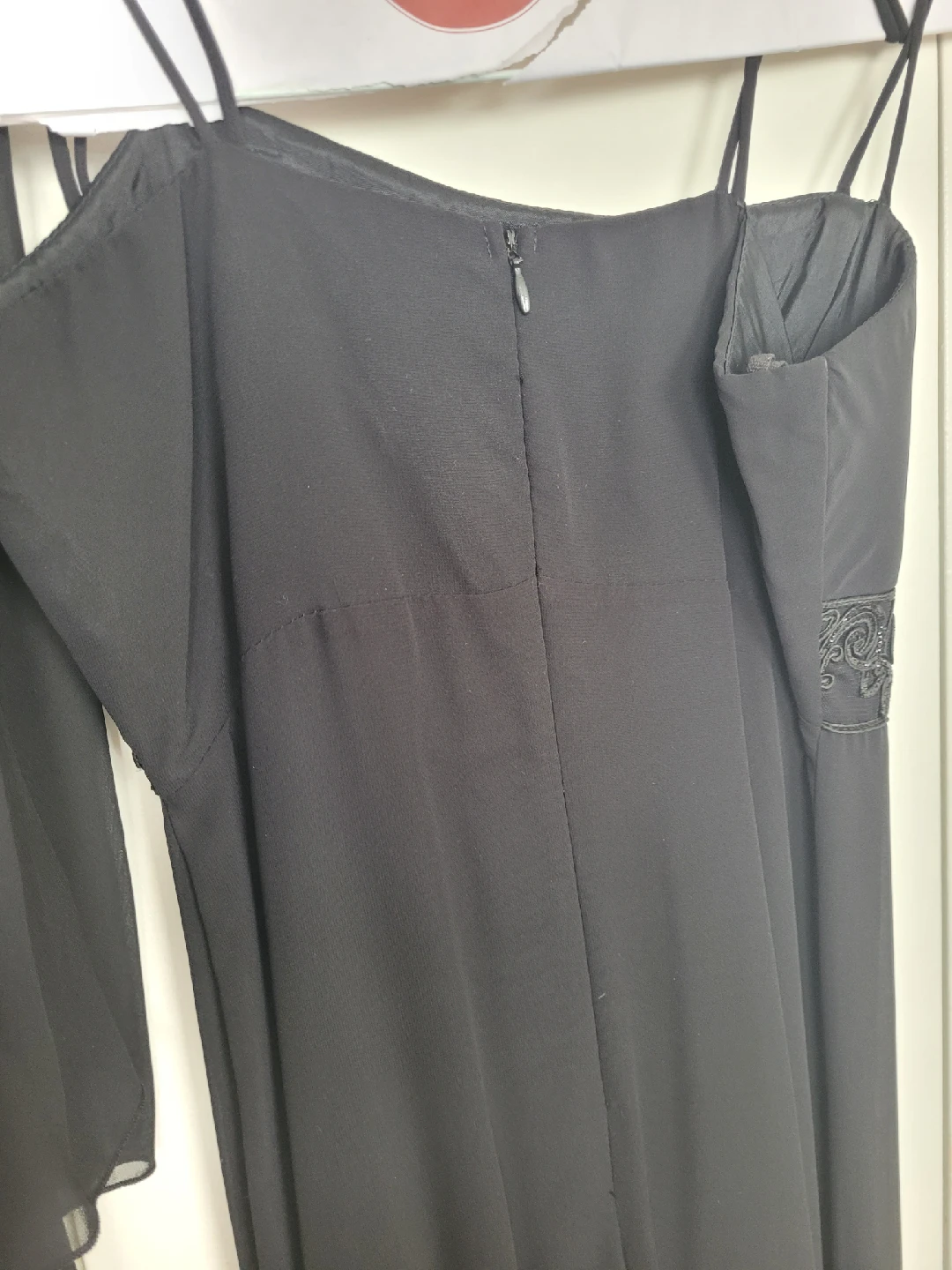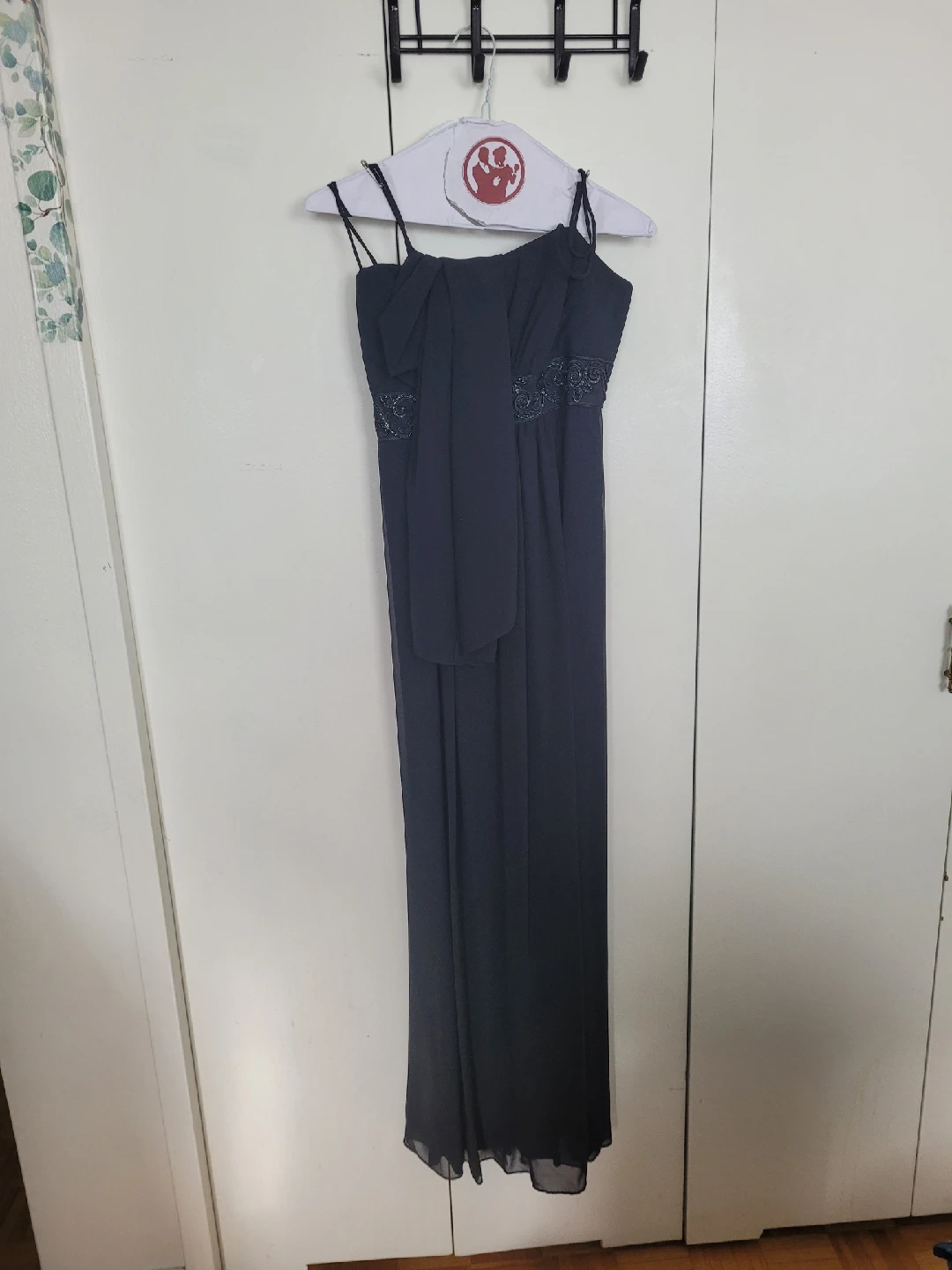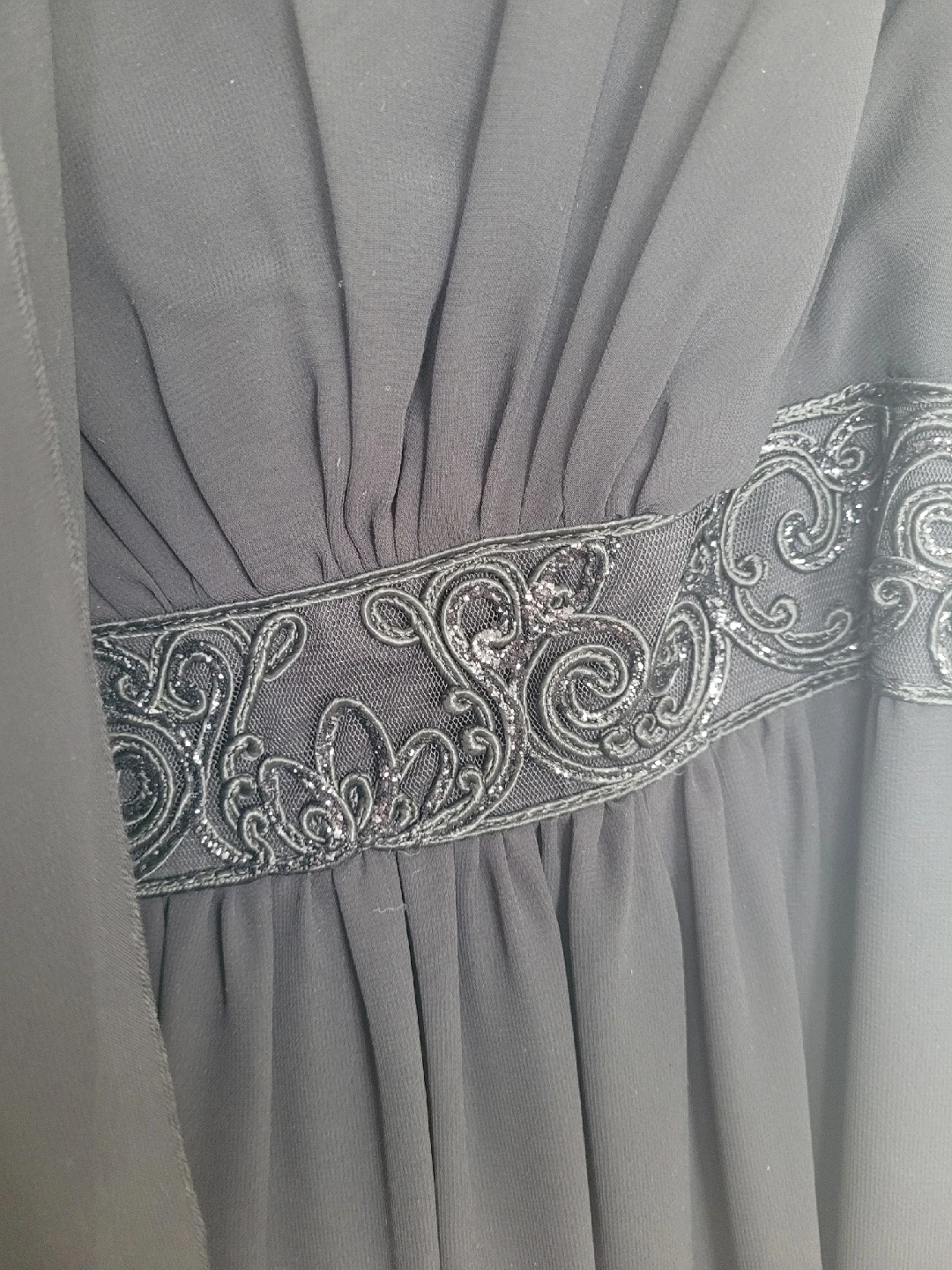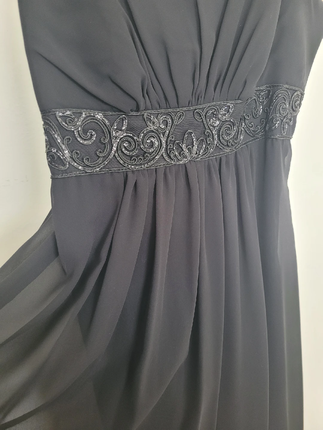 A lovely black dress from Soprano, size medium! The dress has thin straps and a beautiful design around the empire waist. Perfect for a special occasion or a night out. Very flattering cut. Comes with a matching sheer scarf. Freshly dry cleaned and ready for a new home. Floor length Color is dark black phots show a dark grey.