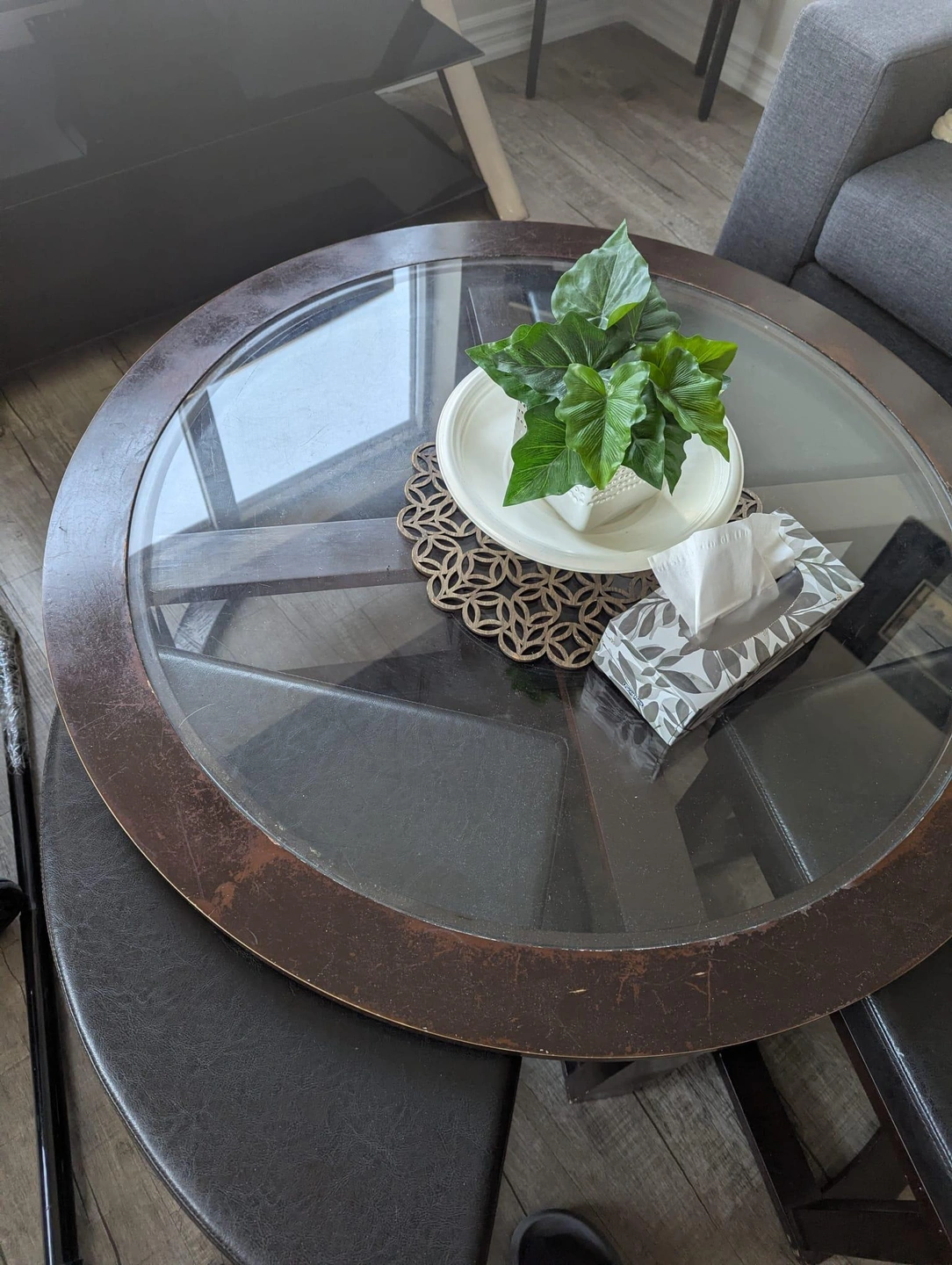 Selling wooden table glass top with 4 leather stool, good for use as small dining table ..