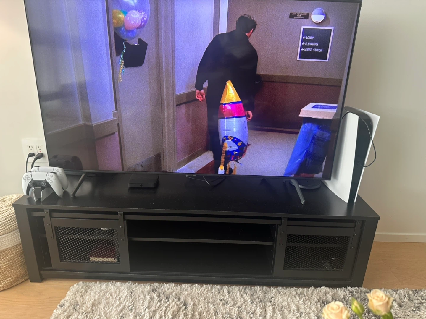 Selling a black TV stand in great condition! Perfect for organizing your entertainment setup. It has open shelving and metal mesh doors, providing a stylish look and practical storage! Dimensions are 59 x 15 x 16 inches.