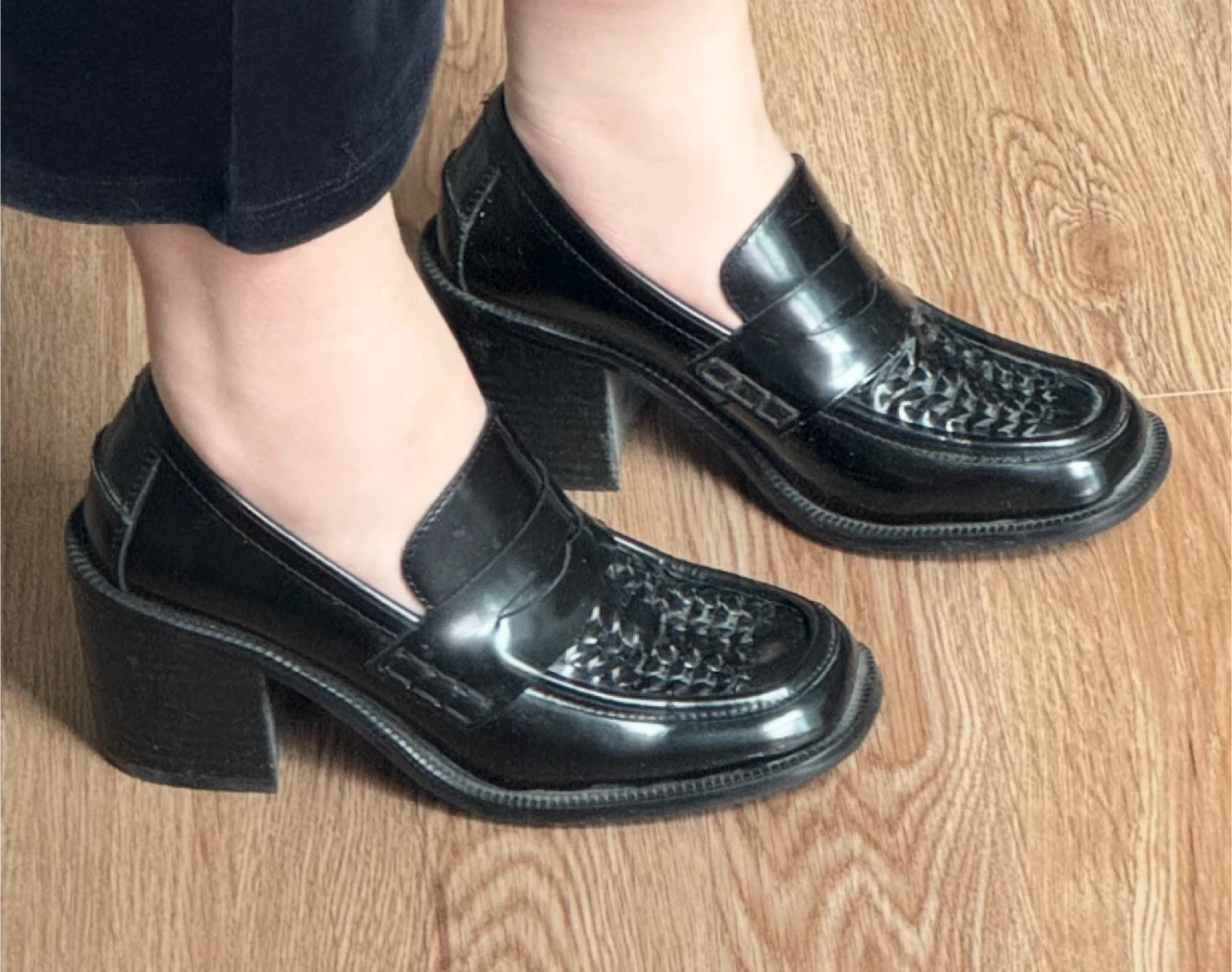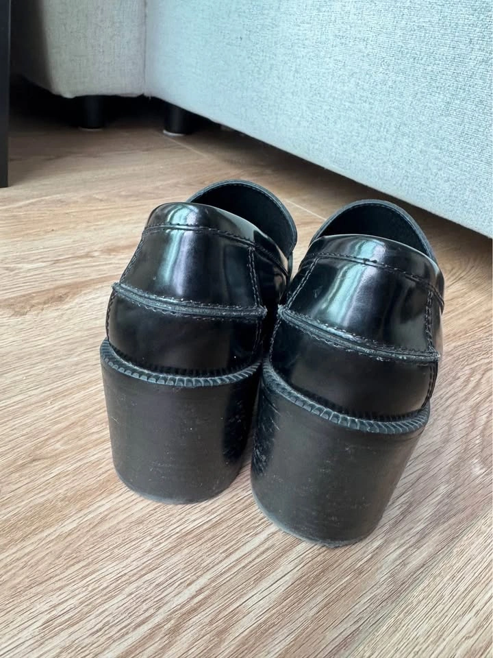 Size 6.5, chunky heeled loafers. Super cute and comfy, I just don’t wear heels anymore.