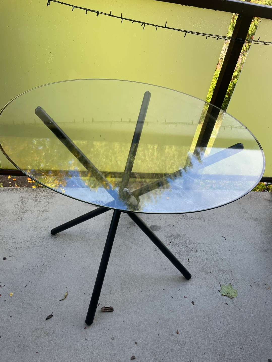 Selling a glass top coffee table with a black metal base. It's in good condition and would be a great addition to any living room or patio space!