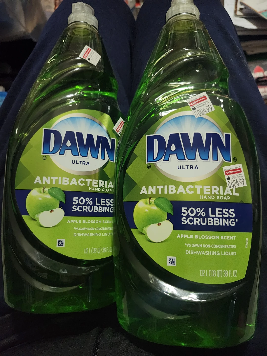 Selling two bottles of Dawn Ultra Antibacterial Hand Soap in the Apple Blossom scent! Each bottle contains 1.12 L (1.18 QT) / 38 FL OZ. It's designed for 50% less scrubbing. Originally bought for $4.99 each!