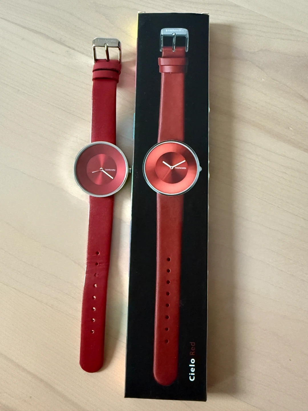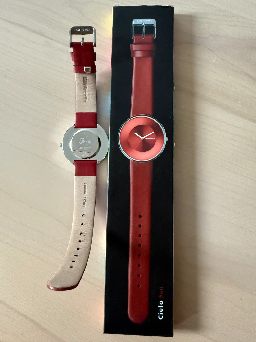 Selling a Lambretta Cielo Red watch! It's in great condition and comes with the original box. The strap is genuine leather, and it's a stylish accessory for any outfit