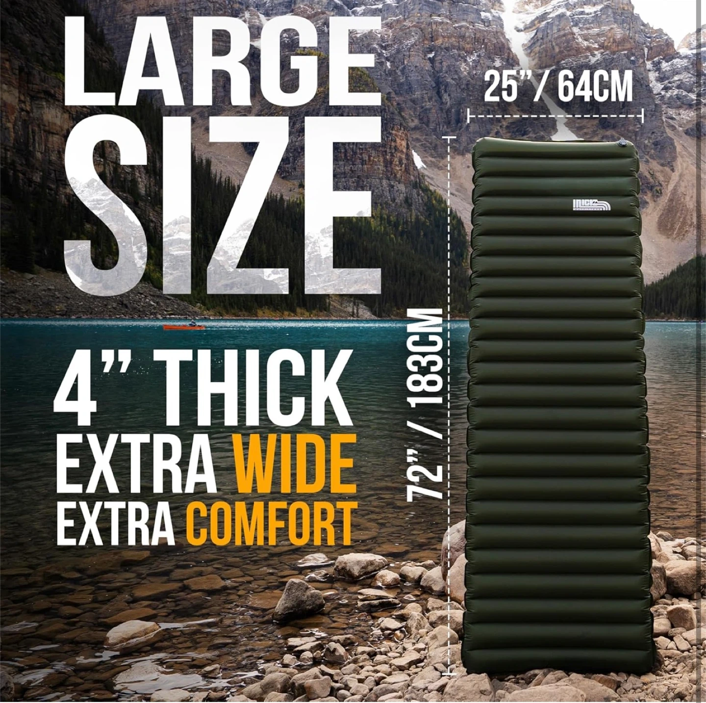 Ultralight Sleeping Pad – 4 Inch Thick Rugged Camping Mat, Durable Tear-Resistant Material, Lightweight Air Mattress for Backpacking, Hiking, Tent – Includes Pump Sack & Repair Kit