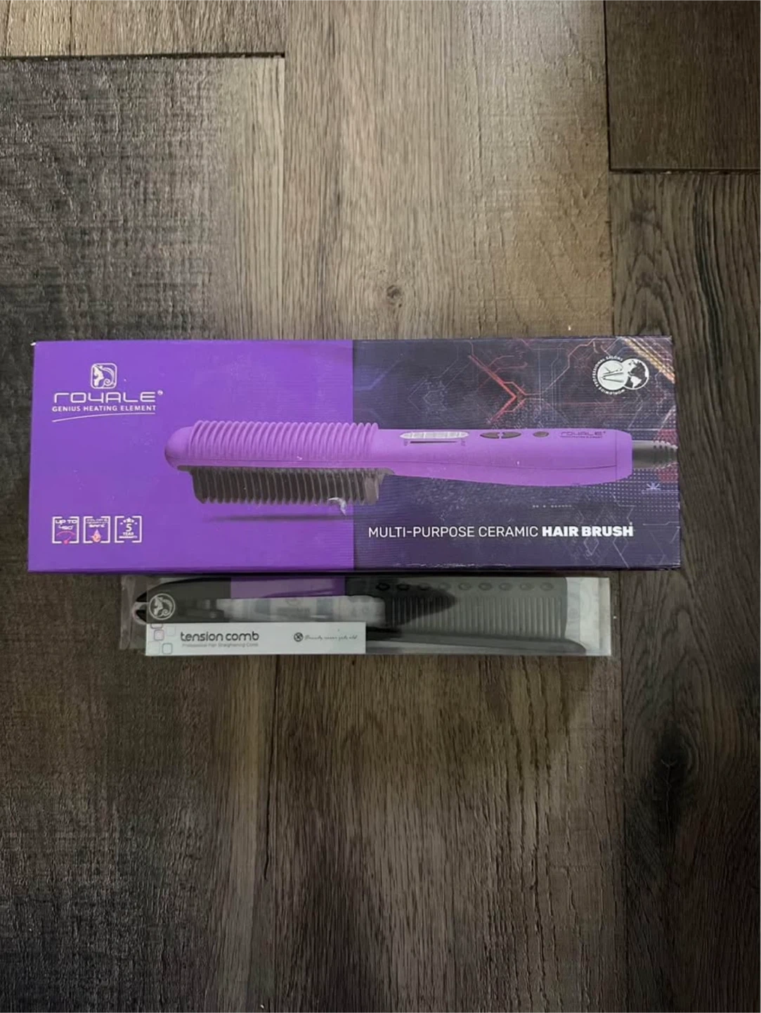 Selling a Royale multi-purpose ceramic hair brush! It comes with the box and a tension comb. The brush is purple and looks to be in great condition. Perfect for quick and easy hair styling