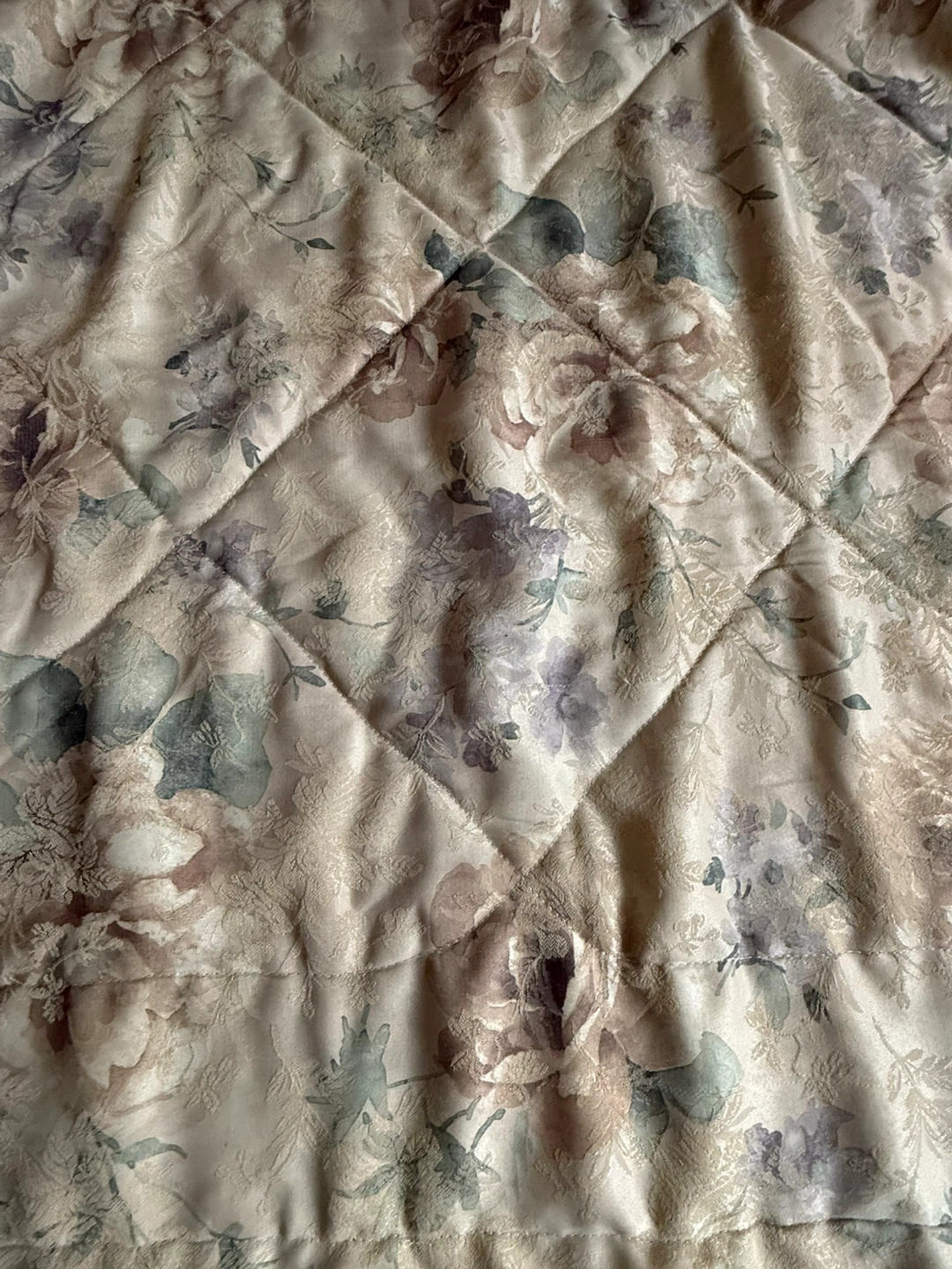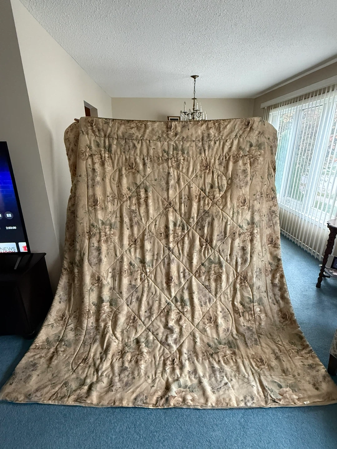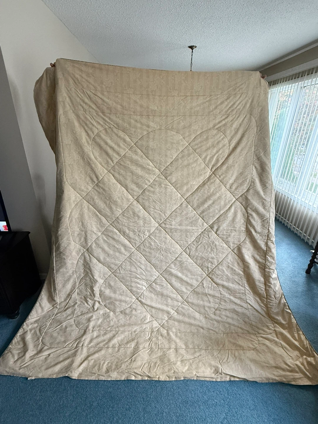 Floral pattern queen size quilted pattern comforter. Gold in colour with rope like trim on three edges. In great condition. Measurements 94” x 86”.