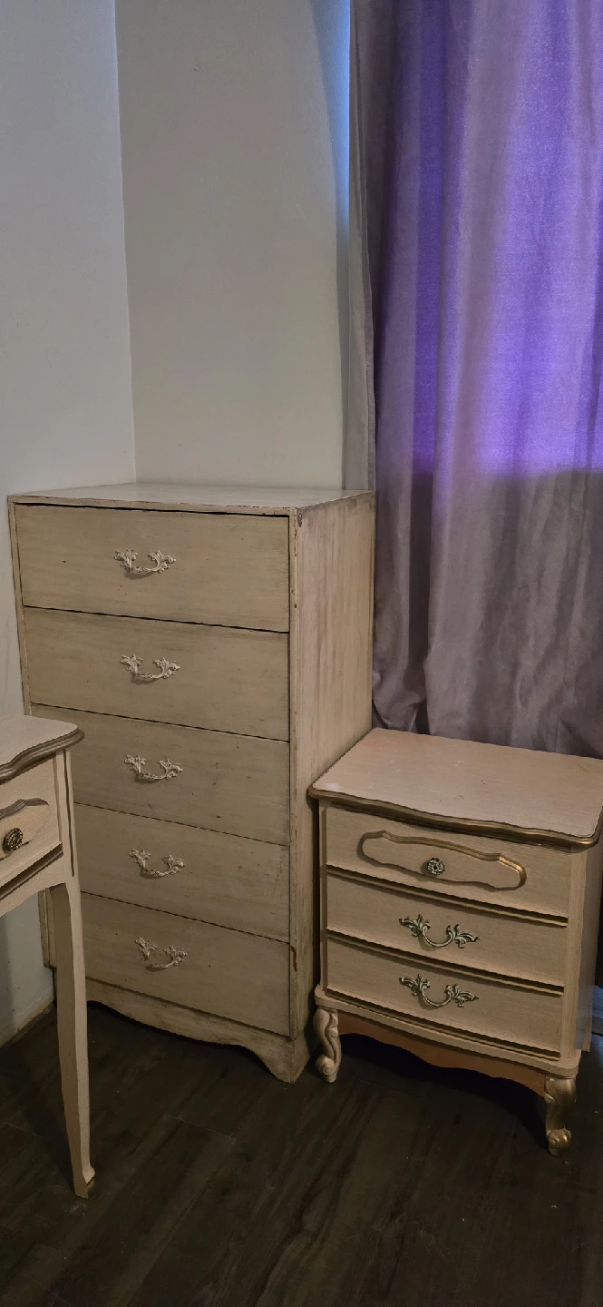 This twin bedroom set comes with a brand new mattress (has been in a plastic cover the whole time), boxspring, nightstand, desk and tall-boy dresser, providing ample storage and a cohesive look for your bedroom. This set has been gently used and is in great condition.