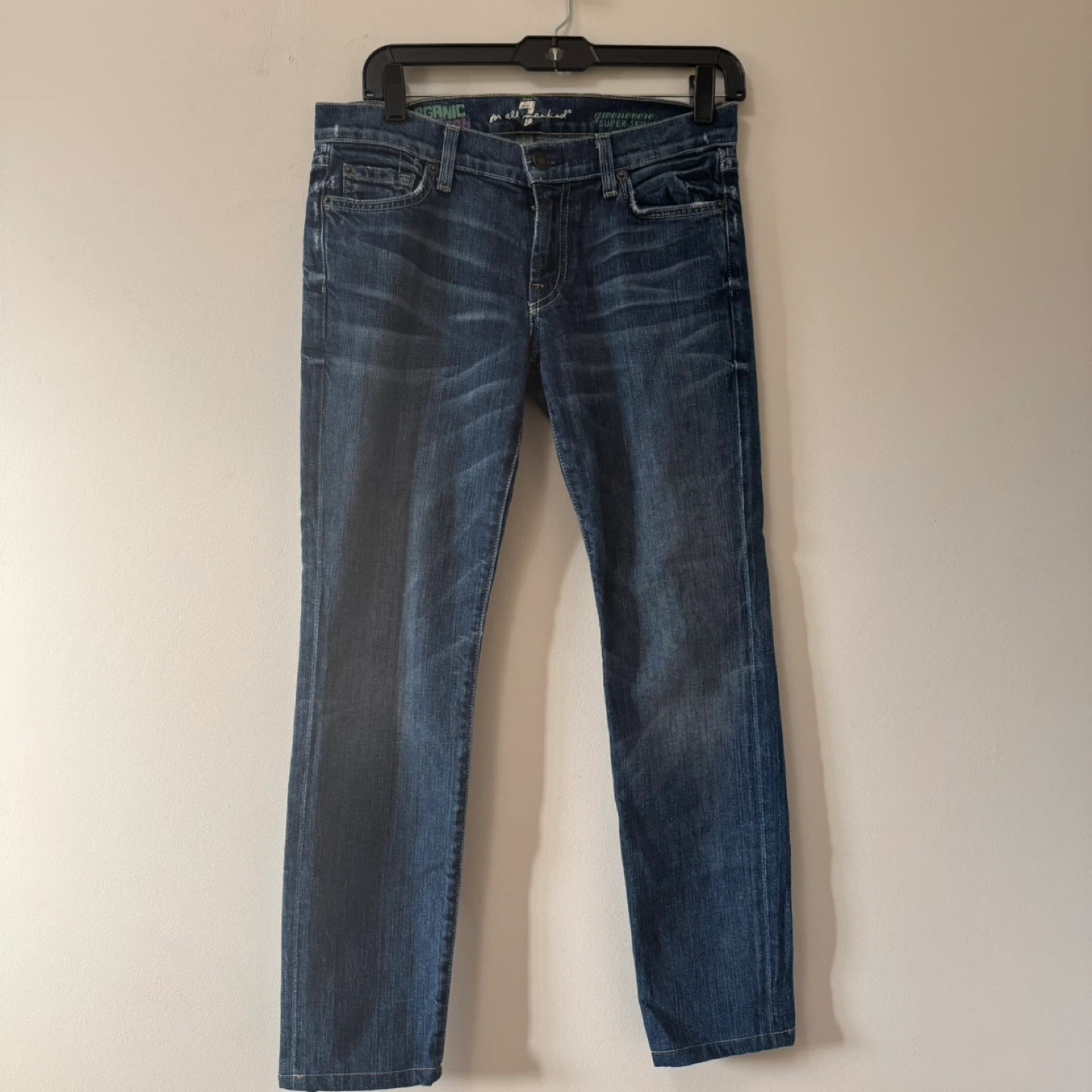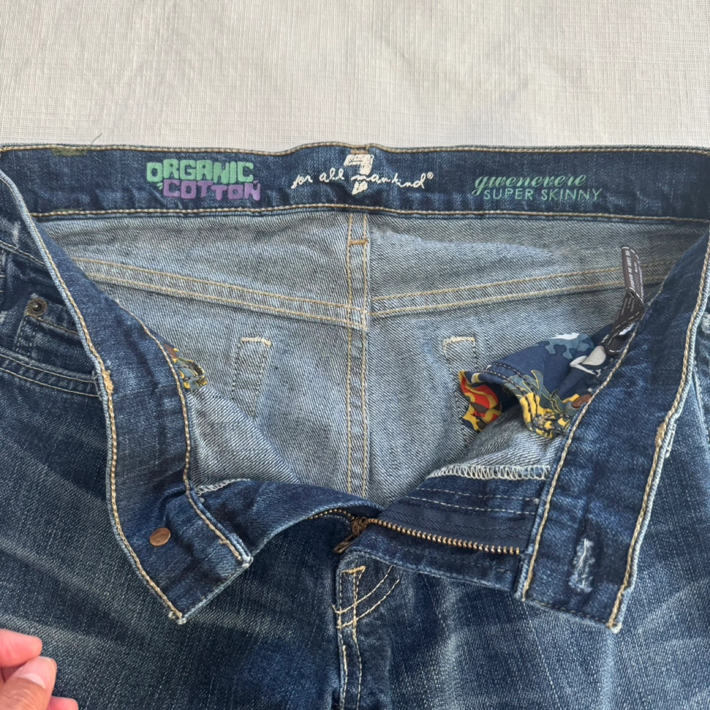 18Selling a pair of 7 For All Mankind Gwenevere Super Skinny jeans. They're a size 26 and made from 98% organic cotton and 2% elastane. The waist measures about 26 inches, and they're in great condition! Custom hem