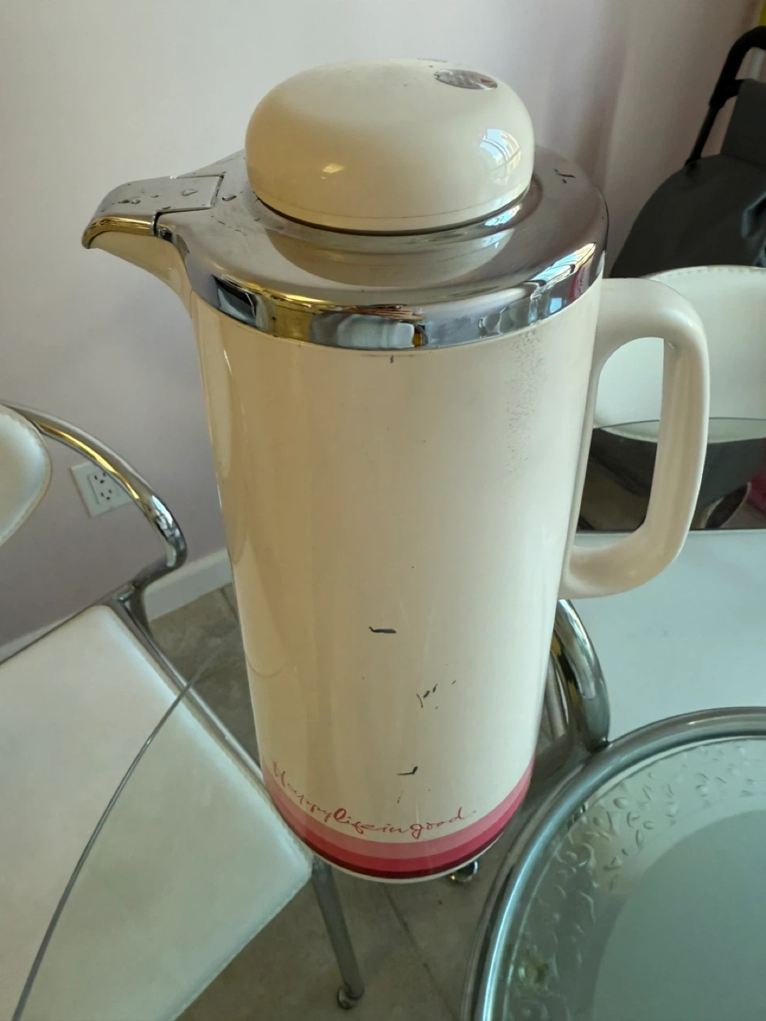 382Selling a Tiger thermal carafe in cream colour. It's a great way to keep your beverages hot or cold for hours. The carafe has some signs of use, but it's still in good working condition. Perfect for coffee, tea, or any other beverage you'd like to keep at the right temperature!