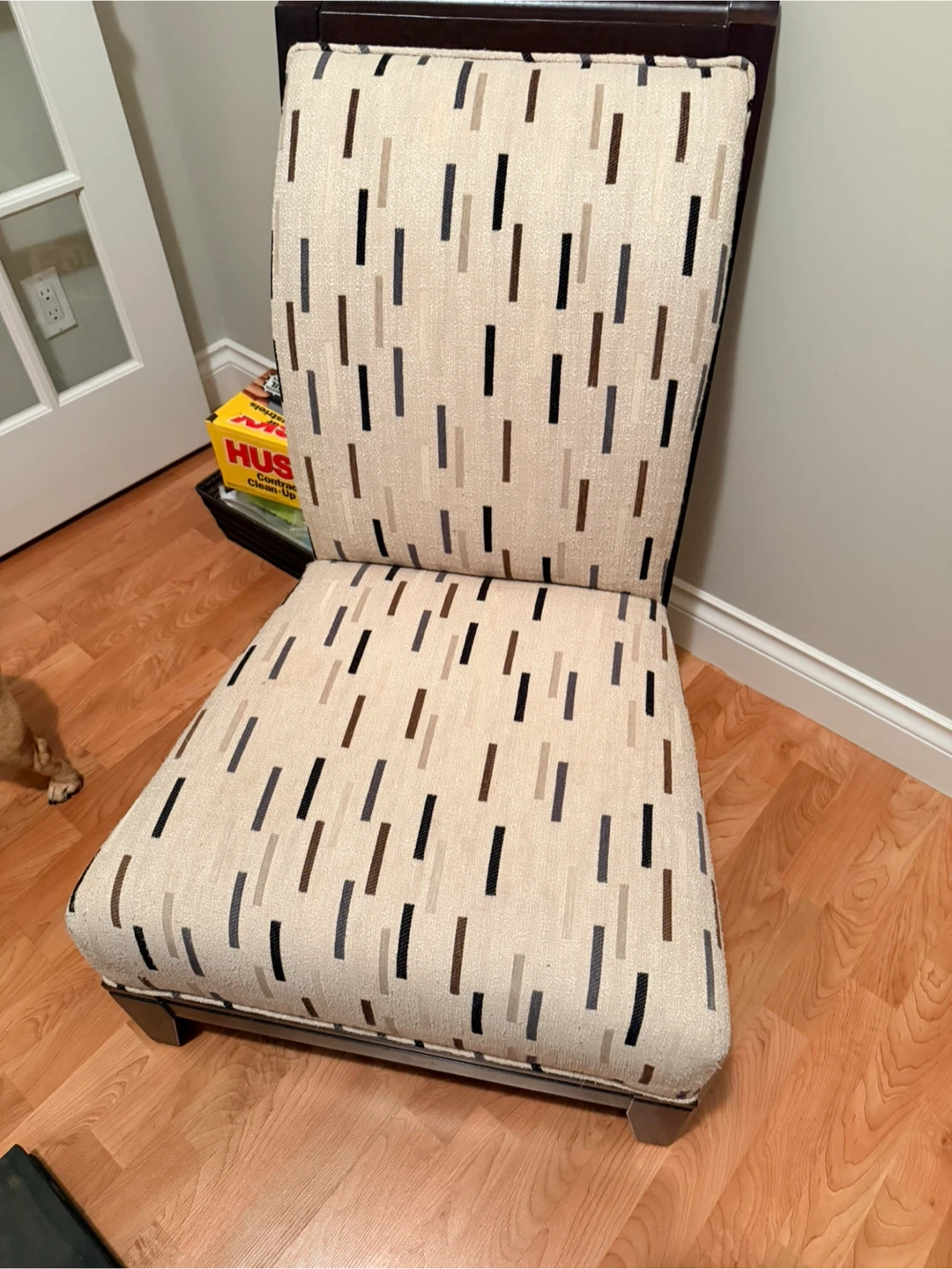 12Selling a dining chair with a patterned upholstered seat and back. The fabric has a neutral tone with stripes of black, brown, and grey. It's in good condition and would be a great addition to any dining space! Set of 2 $80 each