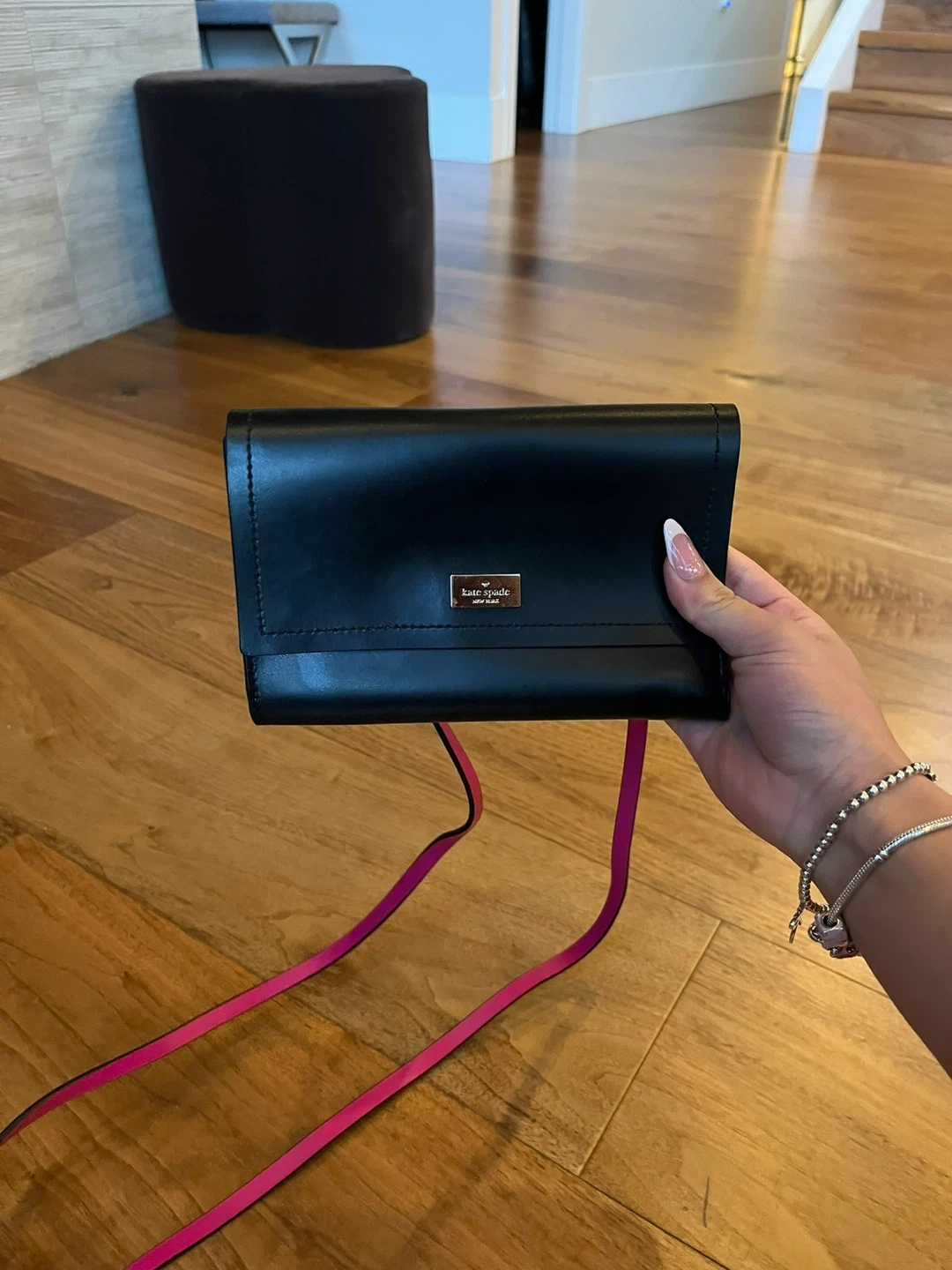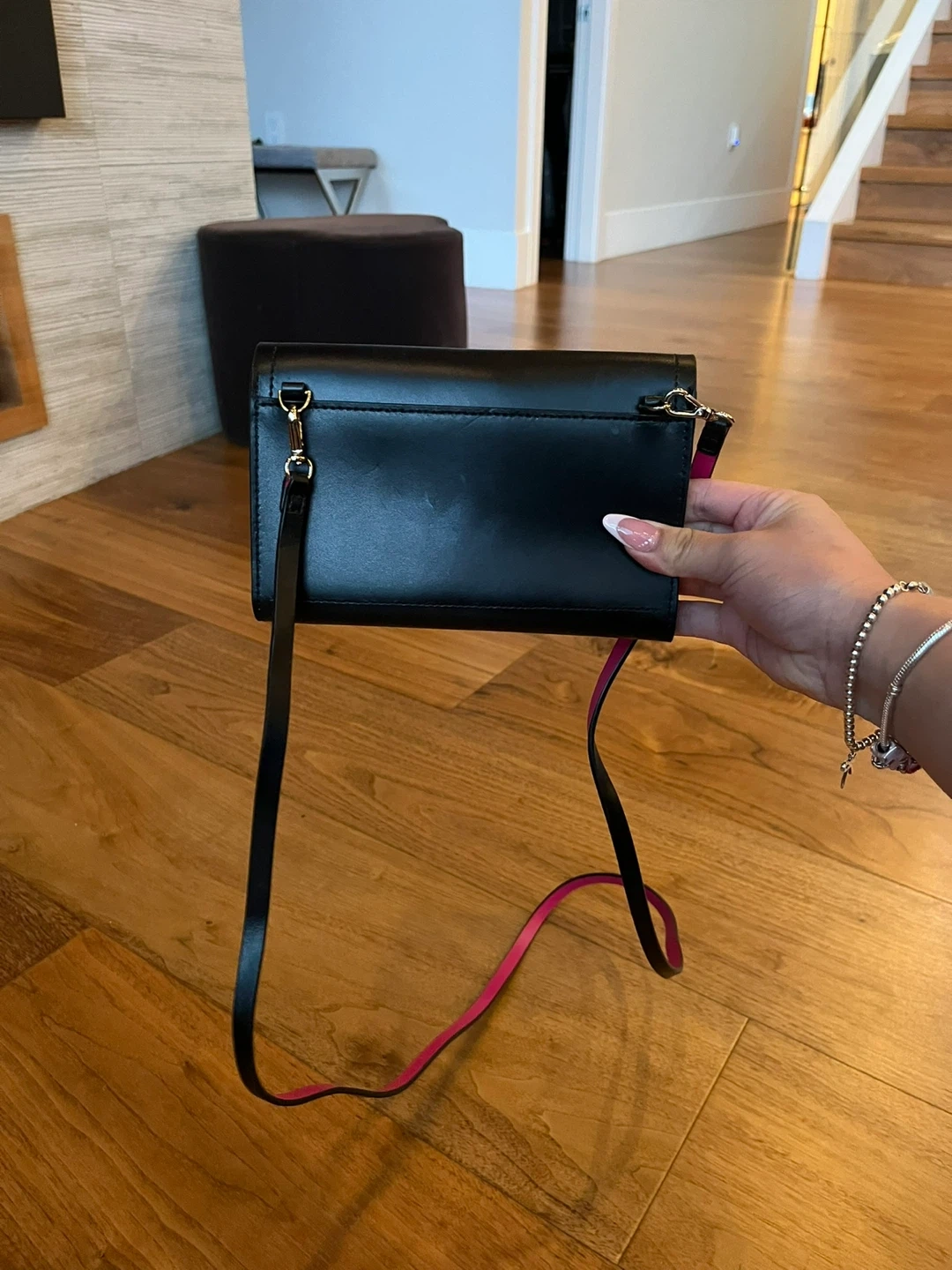 Selling a Kate Spade crossbody bag in black with a vibrant pink interior and strap detail! It's in great condition and perfect for adding a pop of colour to any outfit. It features a sleek design with multiple compartments to keep your essentials organized. Feel free to reach out if you're interested!