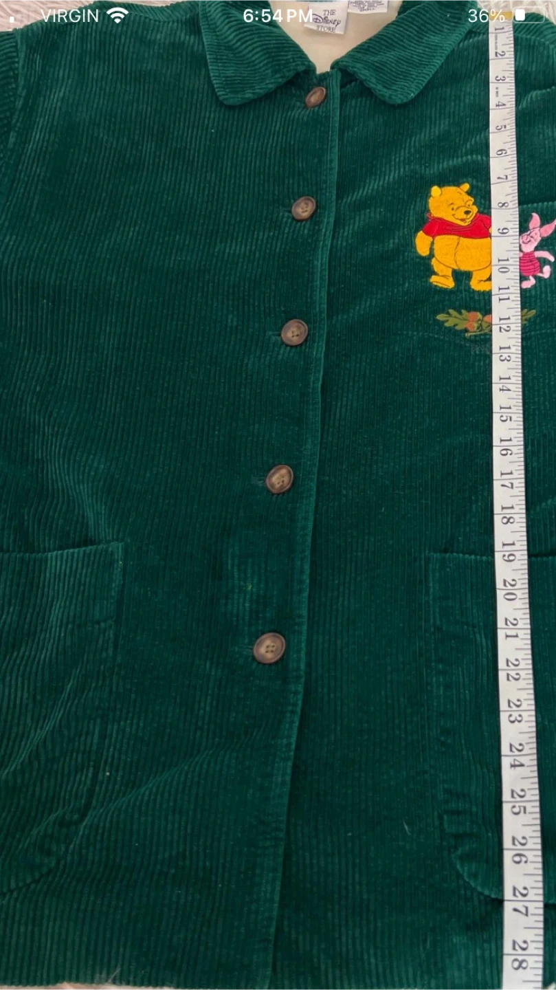 Here's a cute corduroy jacket from the Disney Store featuring Winnie the Pooh and Piglet! It's a lovely green colour and like new. Bought in the 90s, stored since then. Celebrate 100 years of Winnie and friends!