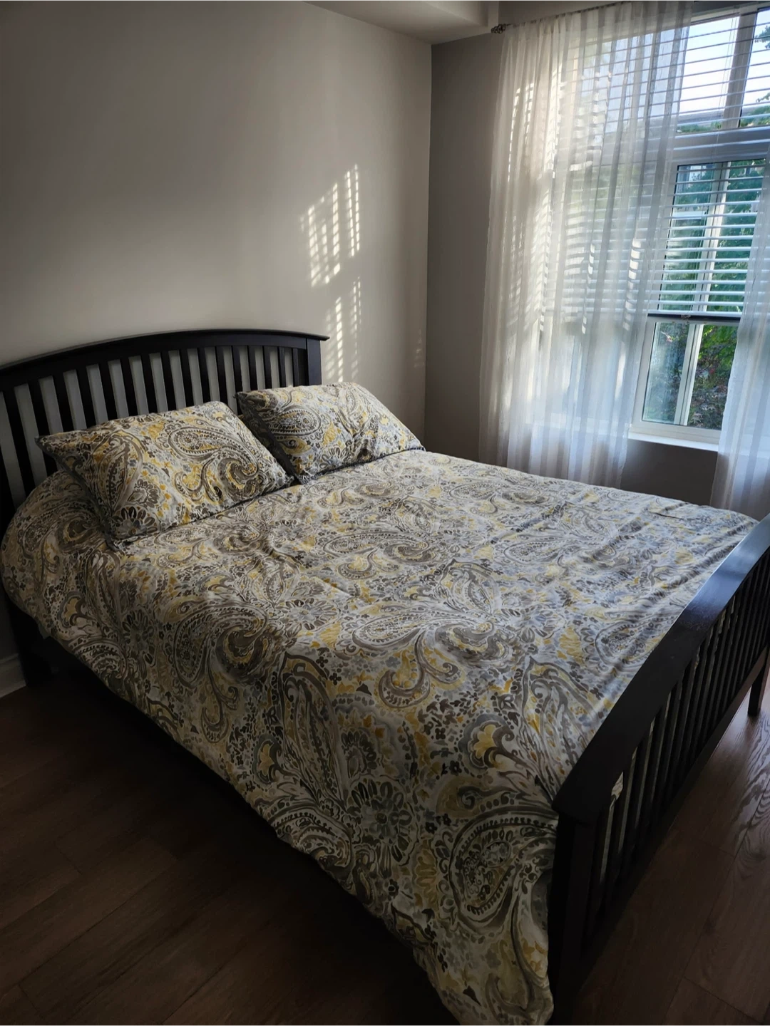 12Selling a queen size bed frame with The frame is a dark colour and the beddingIt's in excellent condition and ready for a new home! Bed frame also has slats so only a mattress is needed if desired