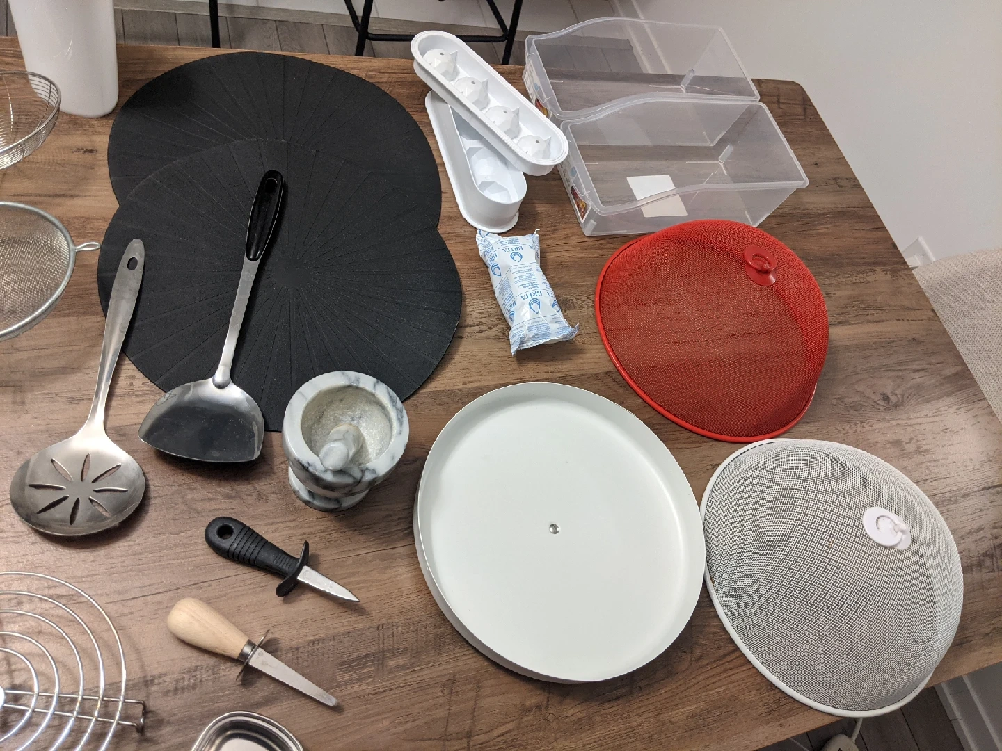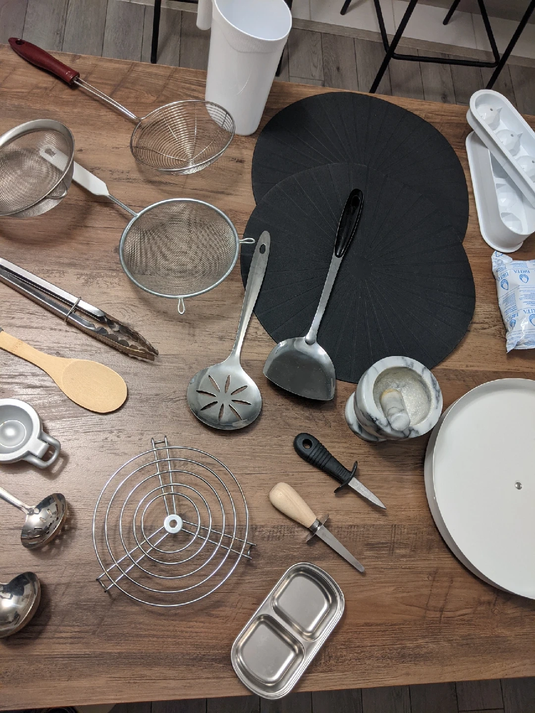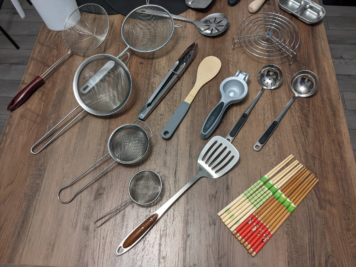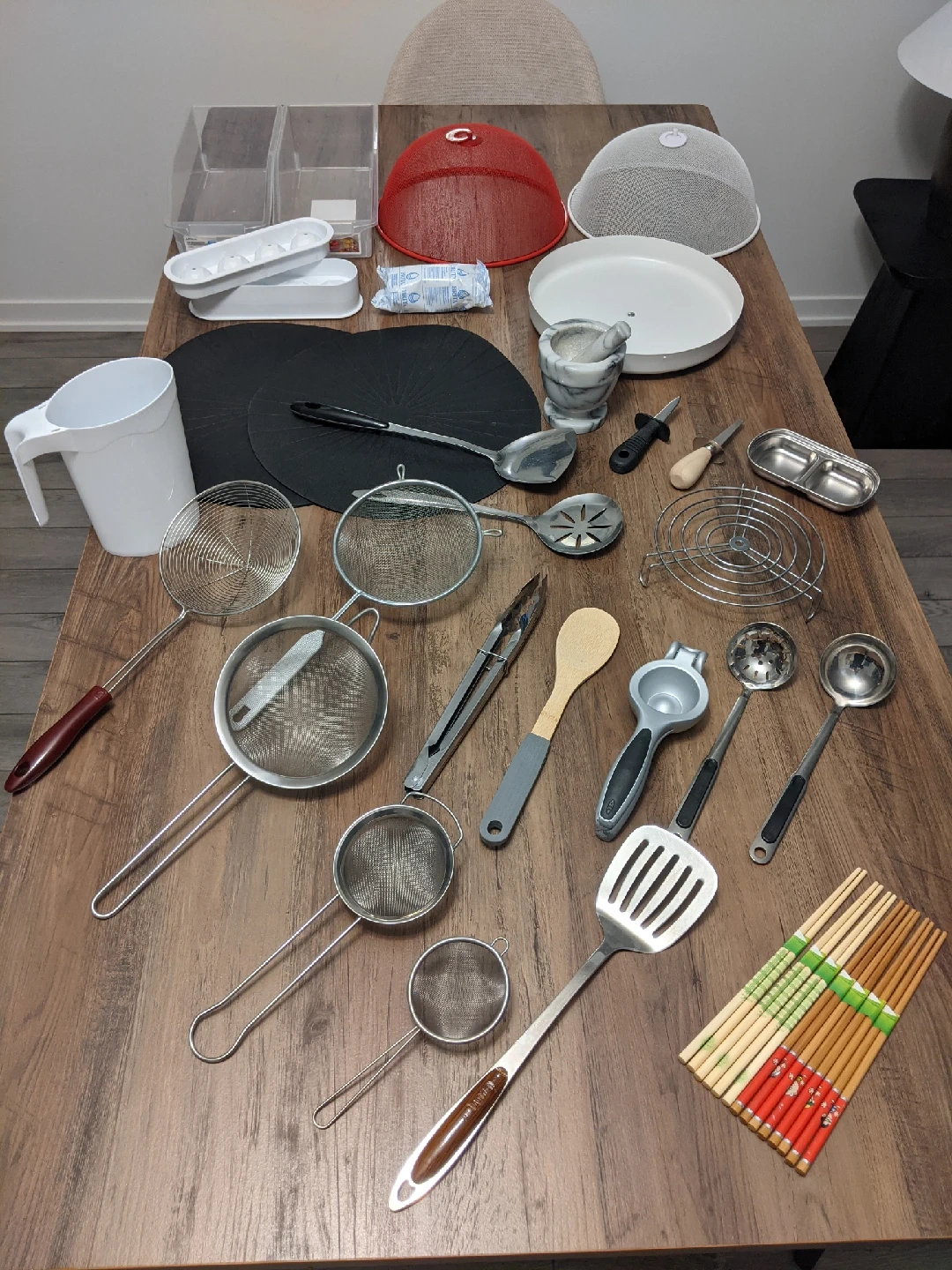 This comprehensive used kitchen supply set includes everything you need for cooking and baking, featuring strainers, spatulas, tongs, and more. The set includes a variety of items, perfect for equipping a new kitchen or upgrading your current collection.