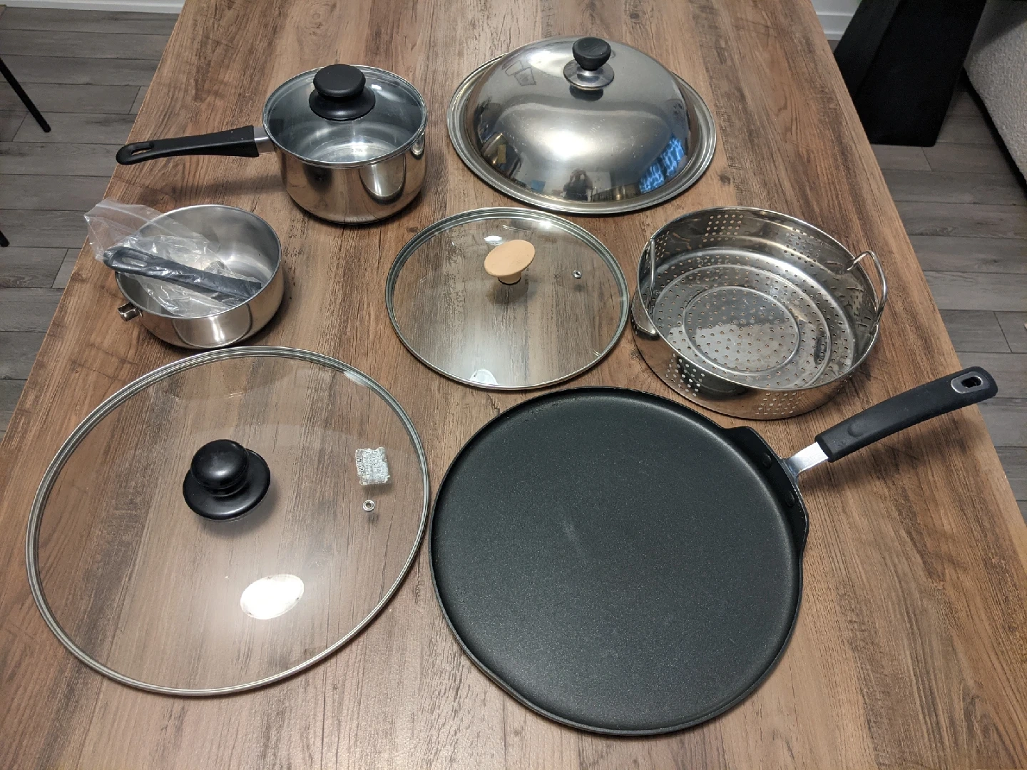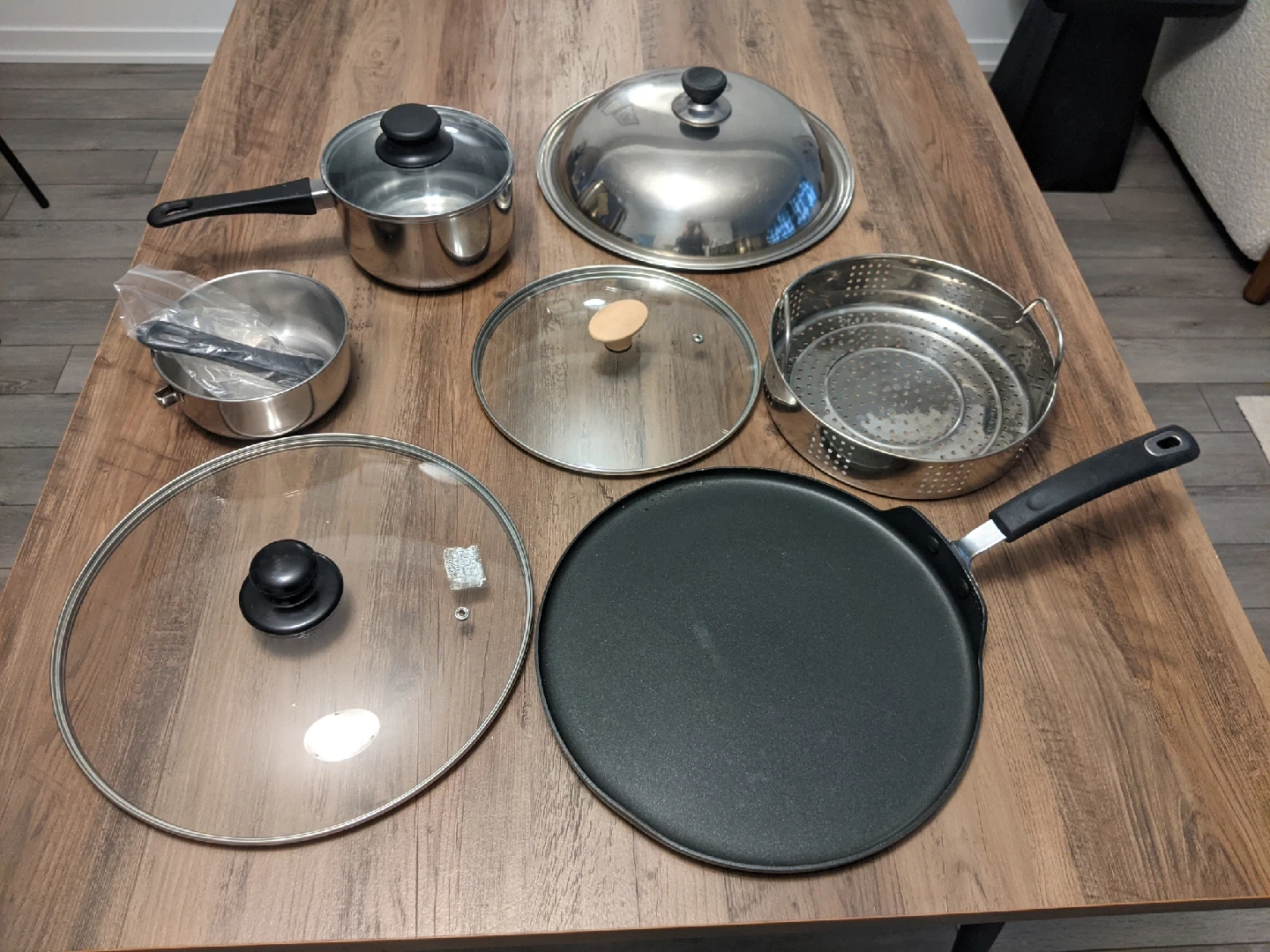 This cookware set includes a variety of pots, pans, and lids, perfect for any kitchen. The set shows signs of use but is still fully functional and ready for your cooking needs. Includes a frying pan, multiple pots with lids and steamer basket, as shown in the pictures.