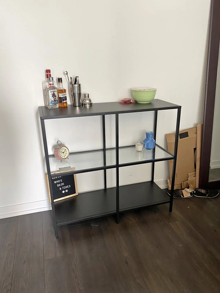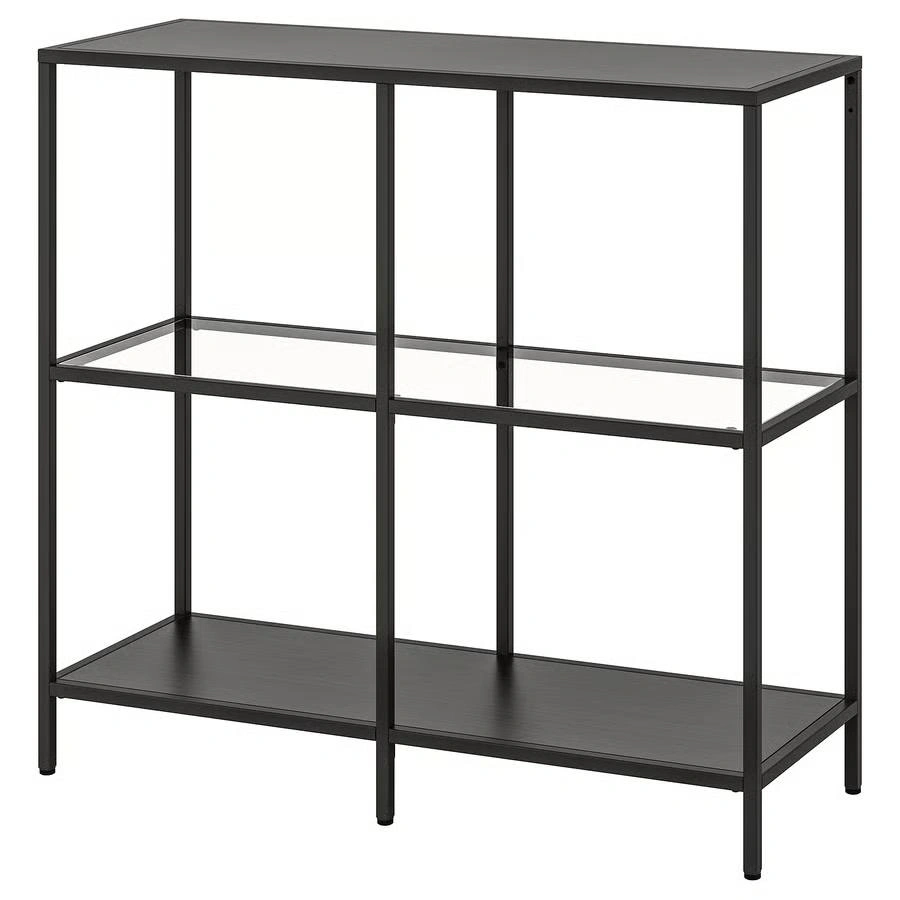 IKEA VITTSJÖ Shelf, metal supports and edges with 2 wooden shelves and 1 glass shelf.