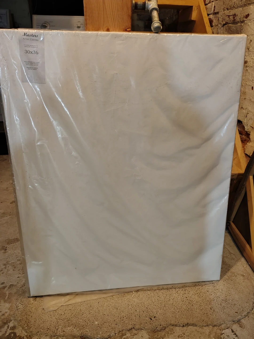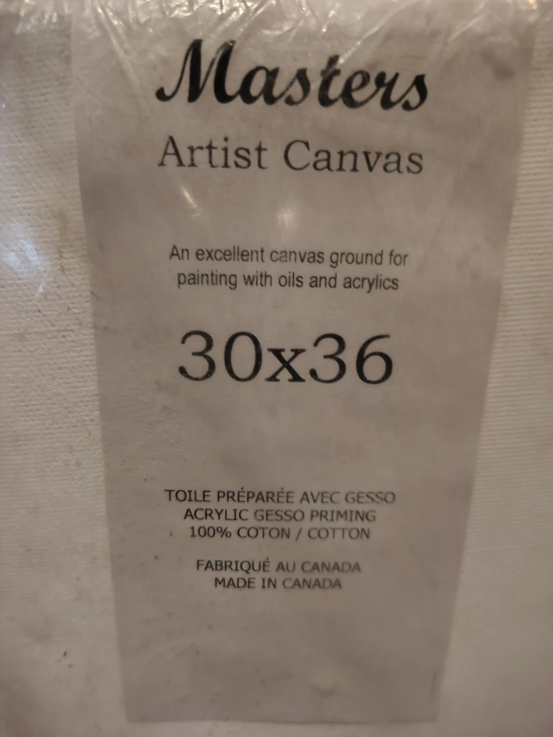 Selling a New Masters Artist Canvas pre-stretched and perfect for painting with oils and acrylics. In its original plastic covering. Purchased at Gwartzman's. It's an excellent canvas ground, prepared with gesso acrylic priming. Made in Canada, it's 100% cotton. The size is 30in x36in