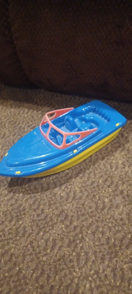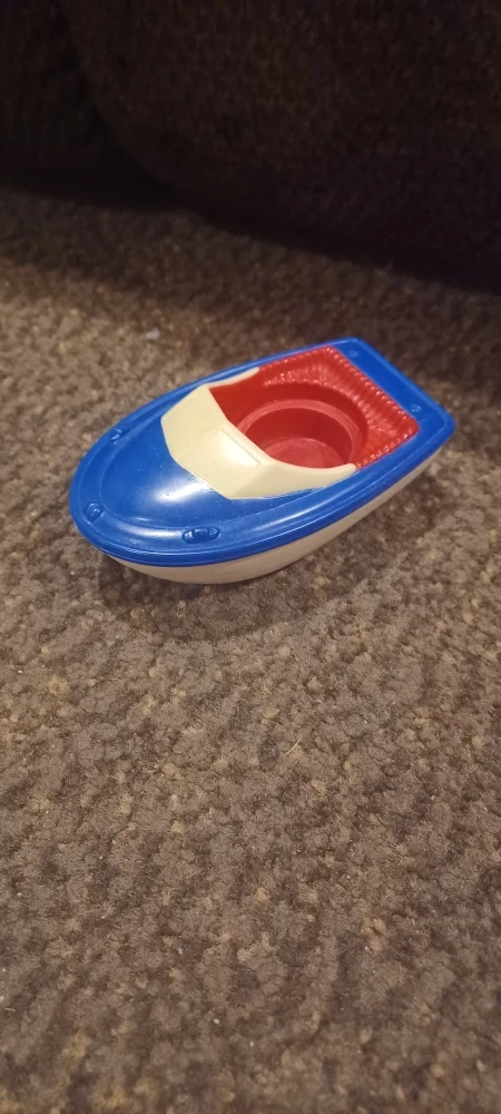 blue and red boat 4 and a half inches long and 3 inches wide