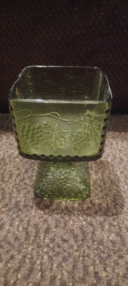 Add a touch of vintage charm to your space with this adorable green glass pedestal bowl