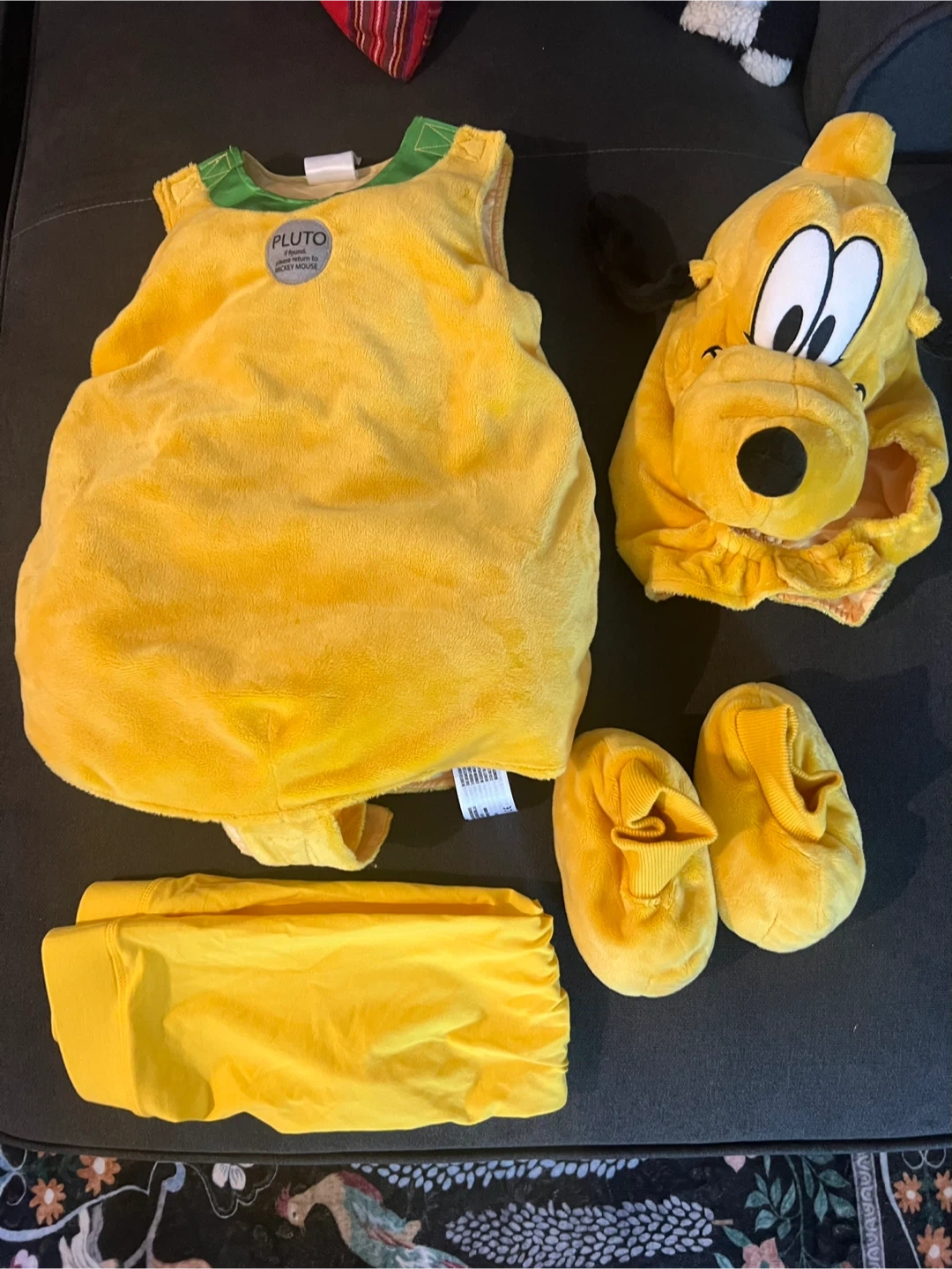 Selling Disney Pluto costume for little ones! Size 18-24 months. It's in great condition. My son wore this for 2-3 hours and refused to wear the hat and shoes so they are untouched! The original costume does not come with the yellow pants. I purchased those on Amazon and I am including those as well. My son is almost 2.5, the leggings are size 3T and as mentioned above, the costume is 18-24 months and it all fit perfectly (though the shoes may have been small on him but he didn’t let us put them on to find out).