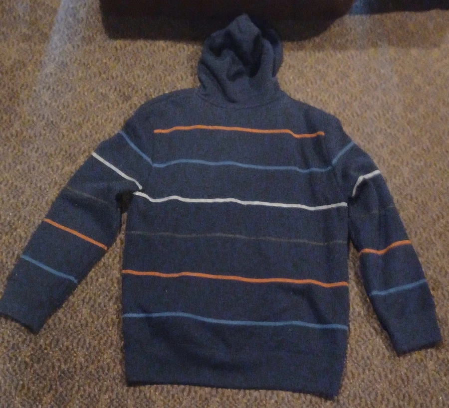 Keep your little one cozy with this gently Joe Fresh kids hoodie, sized XL (14). The hoodie features a stylish striped pattern in shades of blue, orange, and white