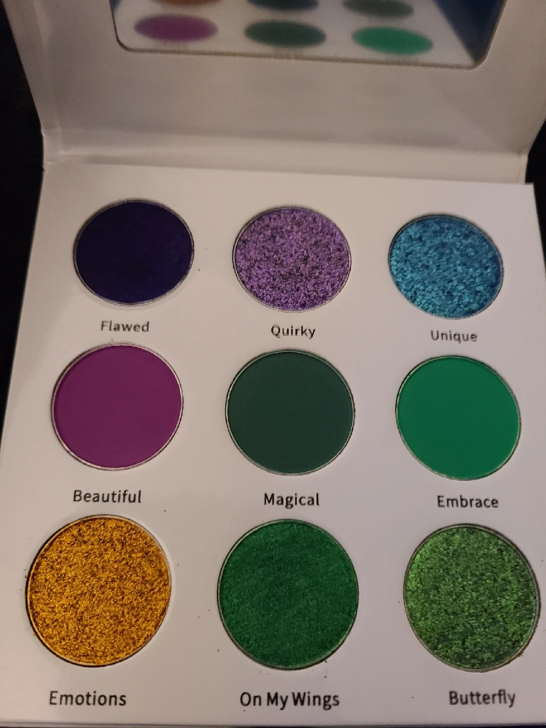 175Sugar Drizzle eyeshadow palette! The palette features a range of colours with names like Flawed, Quirky, Unique, Beautiful, Magical, Embrace, Emotions, On My Wings, and Butterfly!