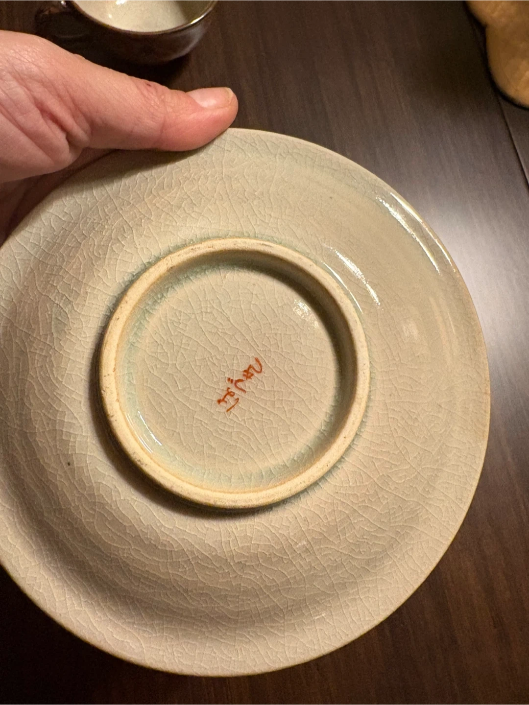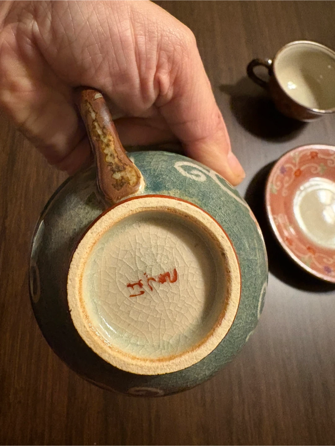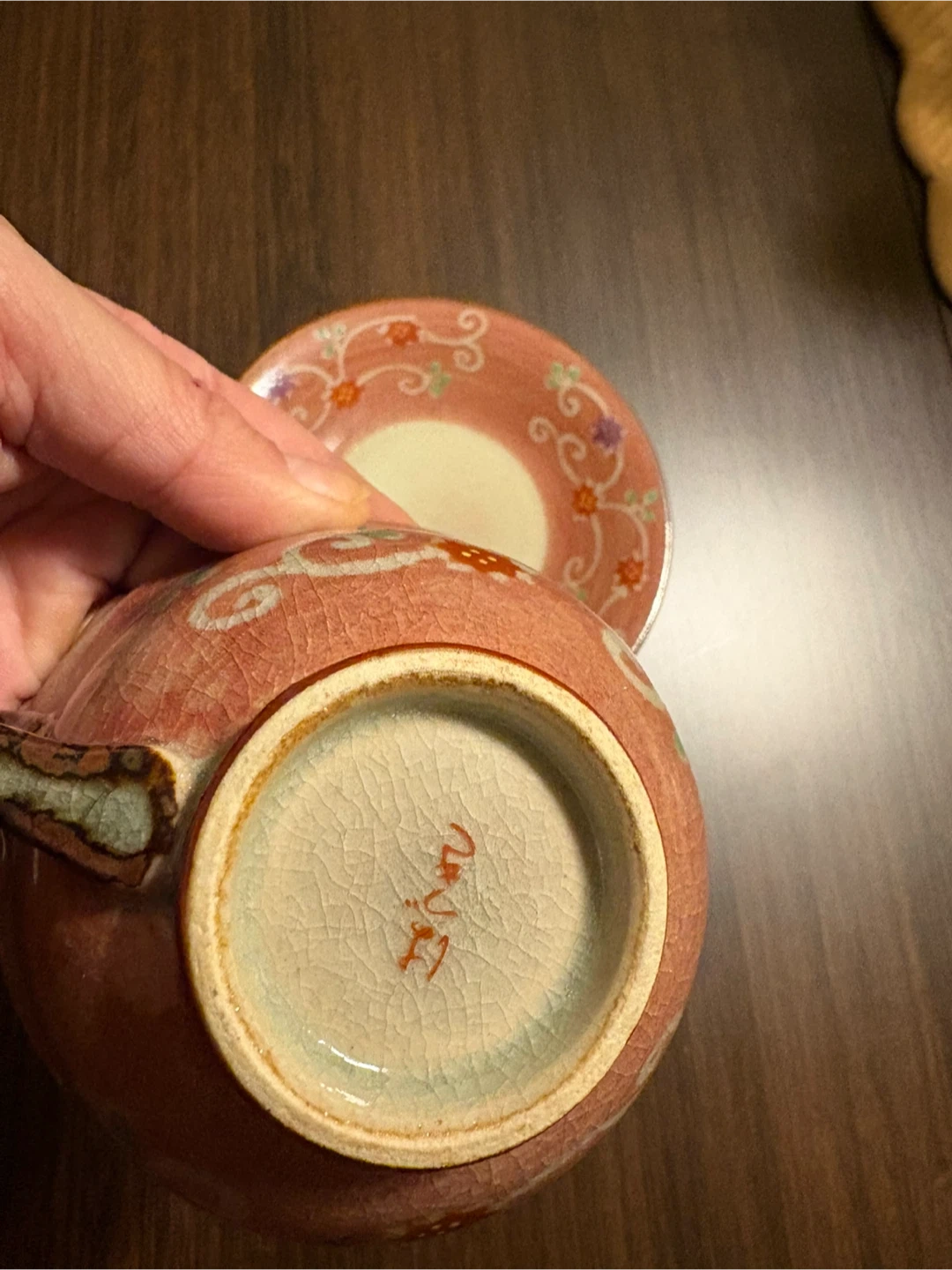 Selling a charming vintage Japanese tea set. It includes a cup and saucer with delicate floral patterns in pink and green. The set has a unique, handcrafted feel with a beautiful crackled glaze. Perfect for adding a touch of elegance to your tea time!