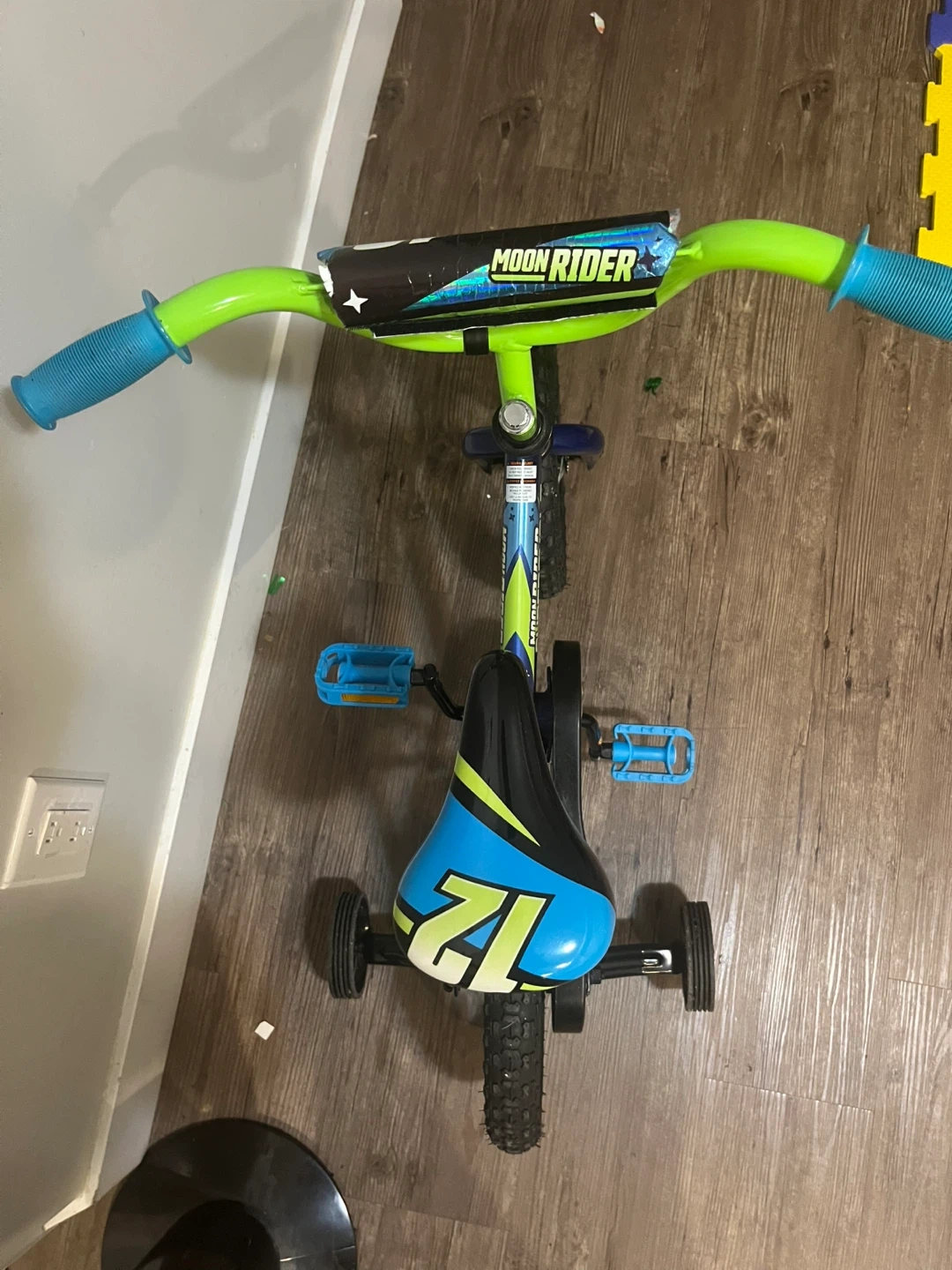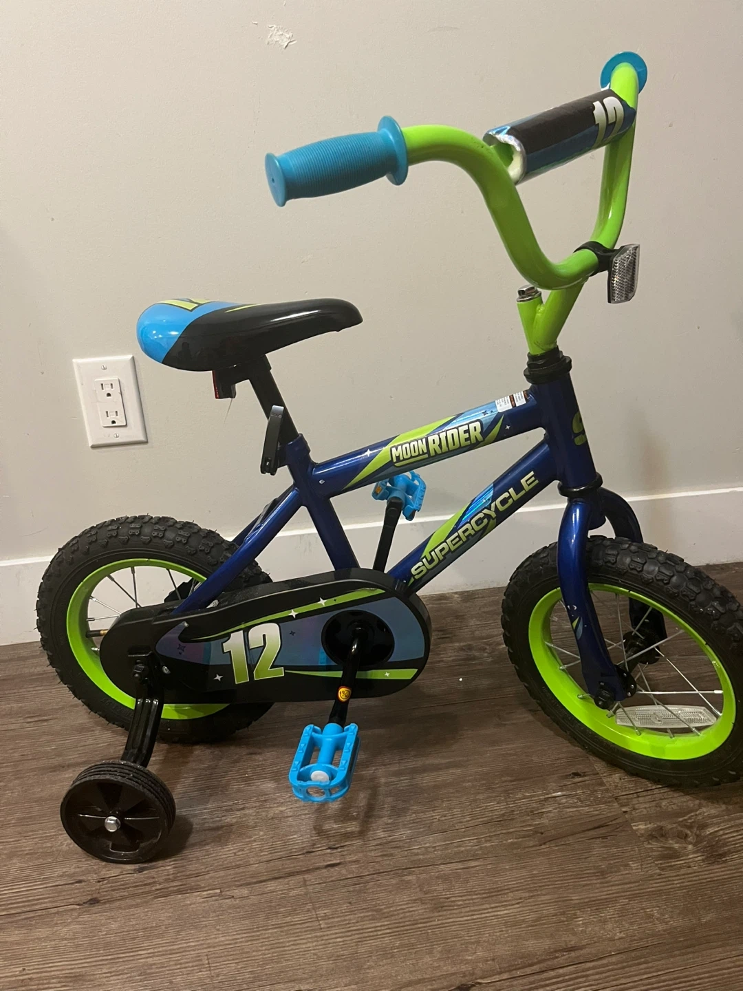 Selling a Canadian tire Supercycle Moon Rider 12-inch kids bike in blue and green. It's a cruiser bike type suitable for toddlers aged 1-5