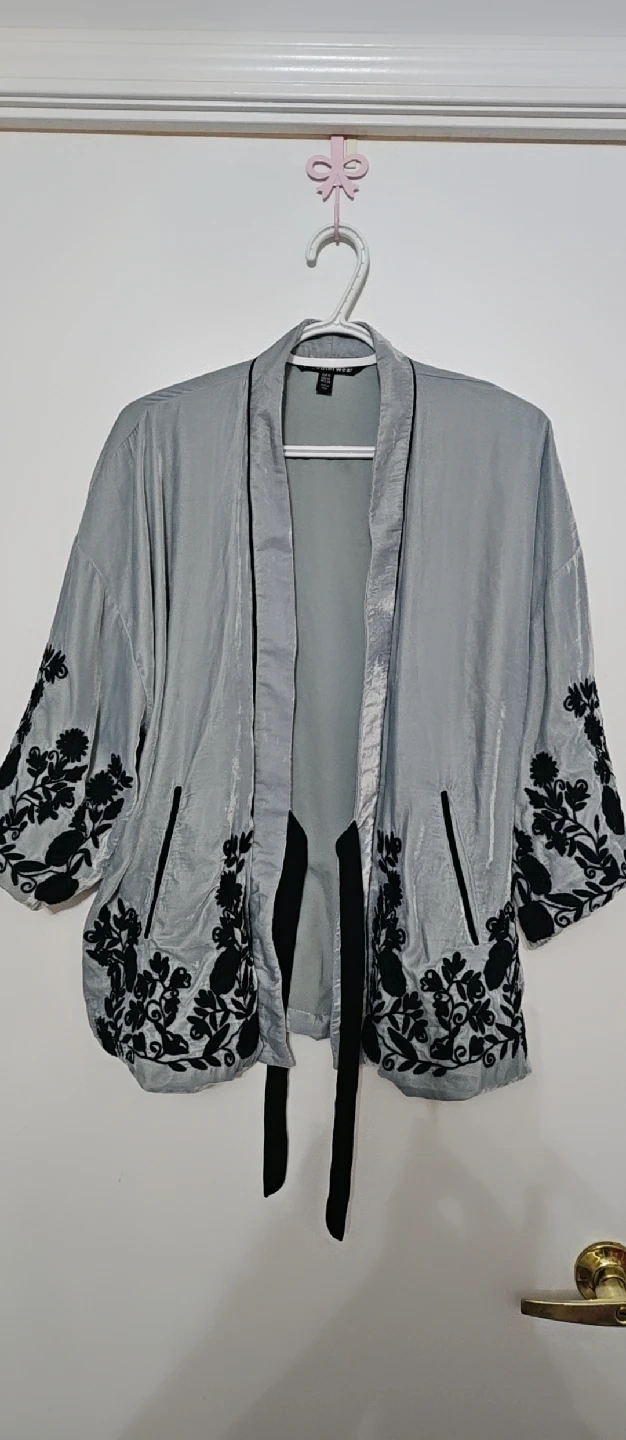 1000+Women's Wear kimono style robe in a light blue colour with black floral embroidery. It has a tie closure and pockets.