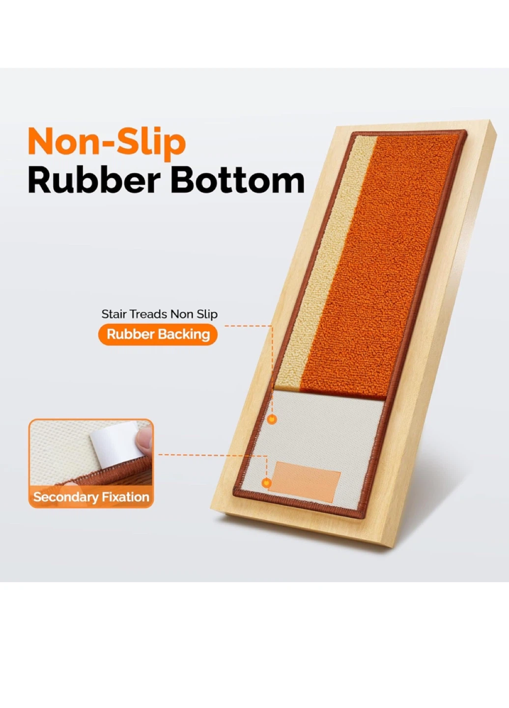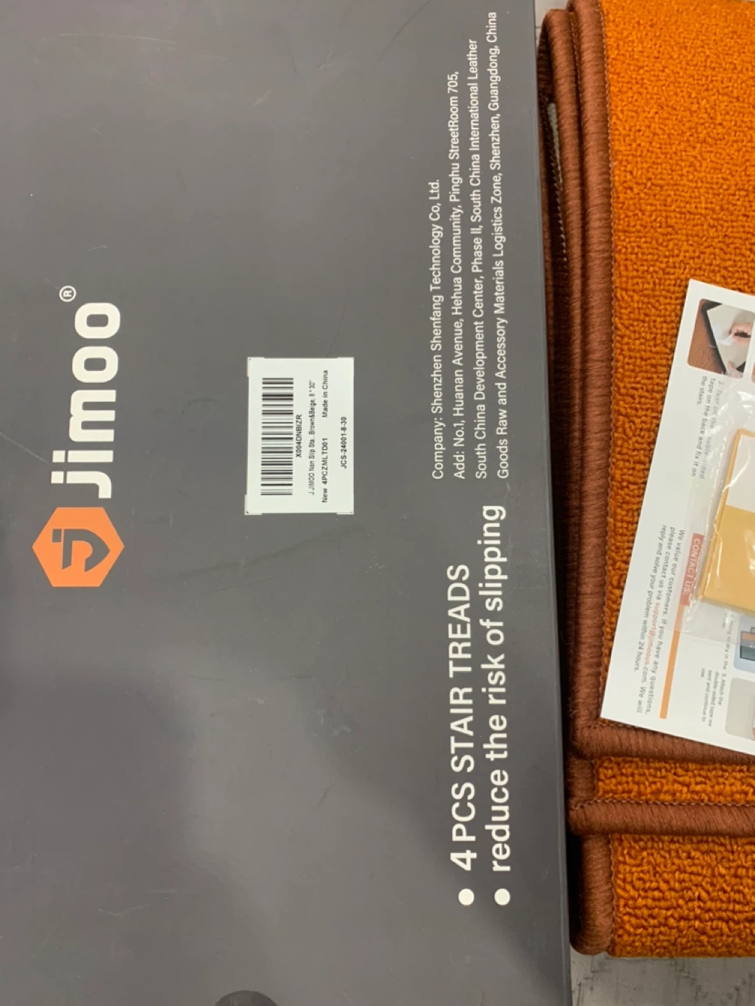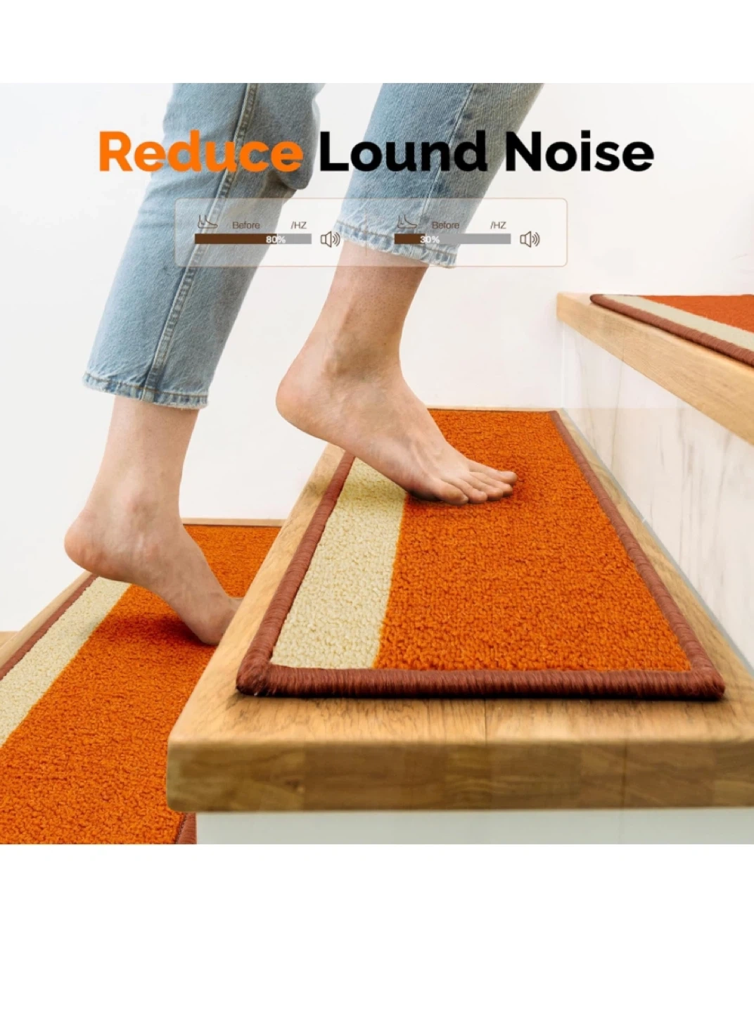 Selling a set of 4 Jimoo stair treads in orange and beige. Each tread measures 8" x 30".