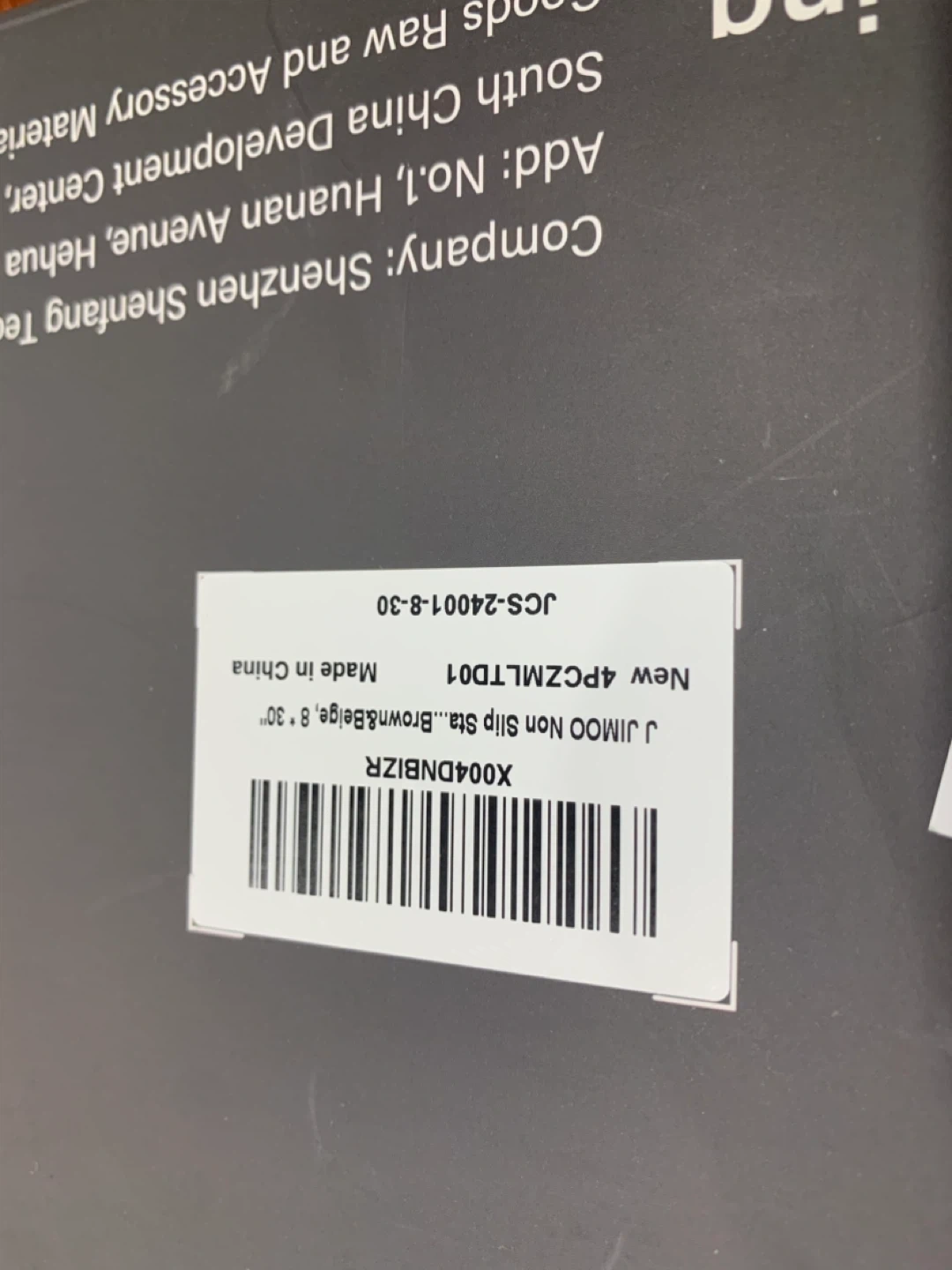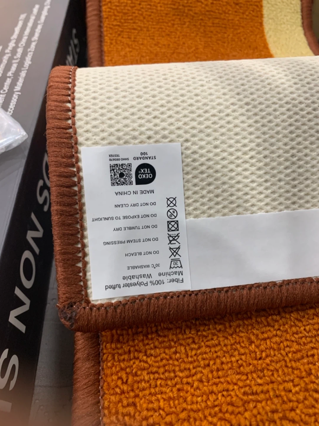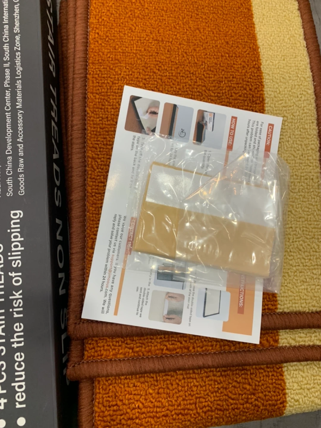 Selling a set of 4 Jimoo stair treads in orange and beige. Each tread measures 8" x 30".