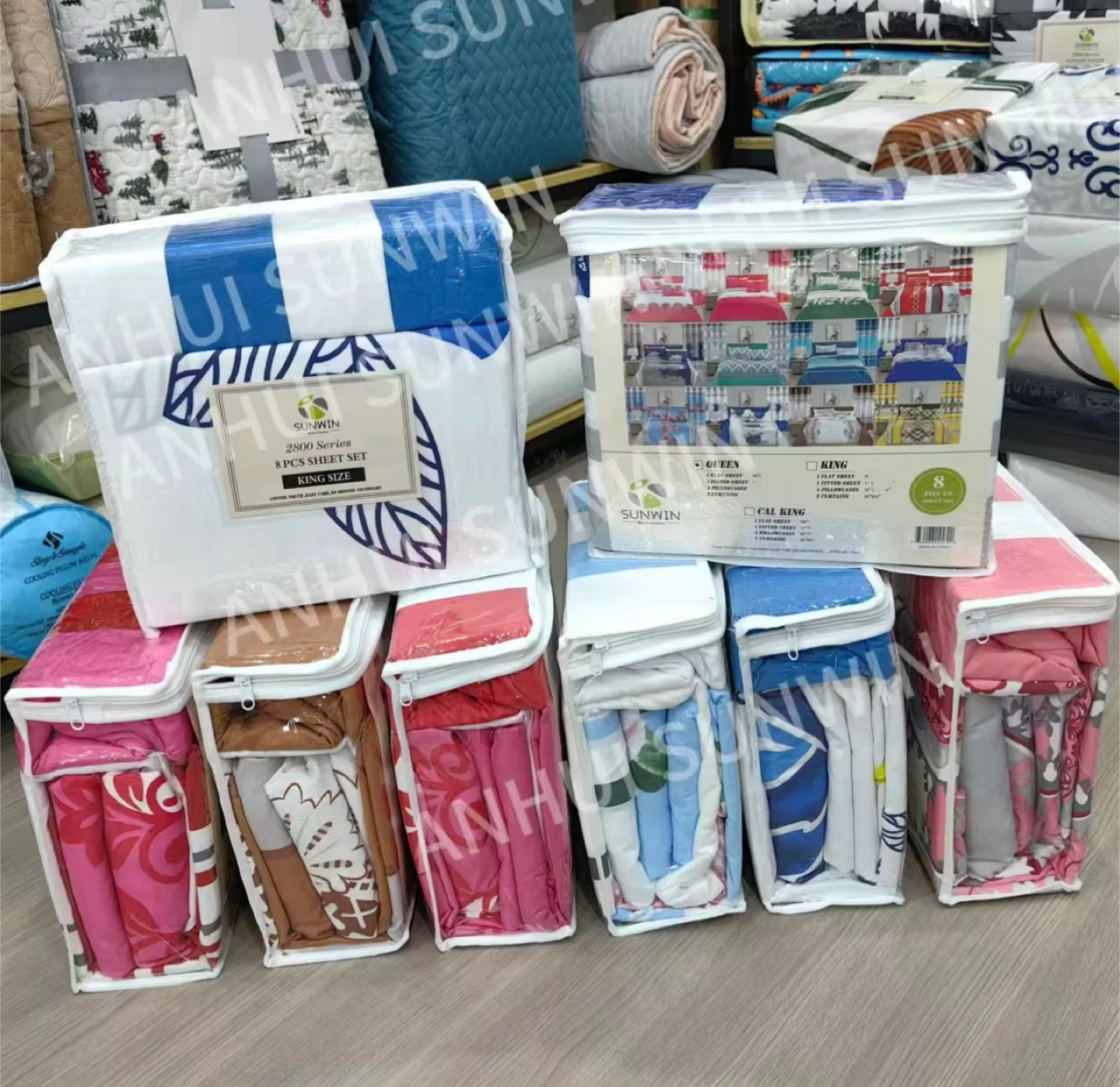 I have a brand new 8-piece sheet set for a king-size bed. It includes a flat sheet, fitted sheet, pillowcases, and curtains! The set is still in its original packaging.