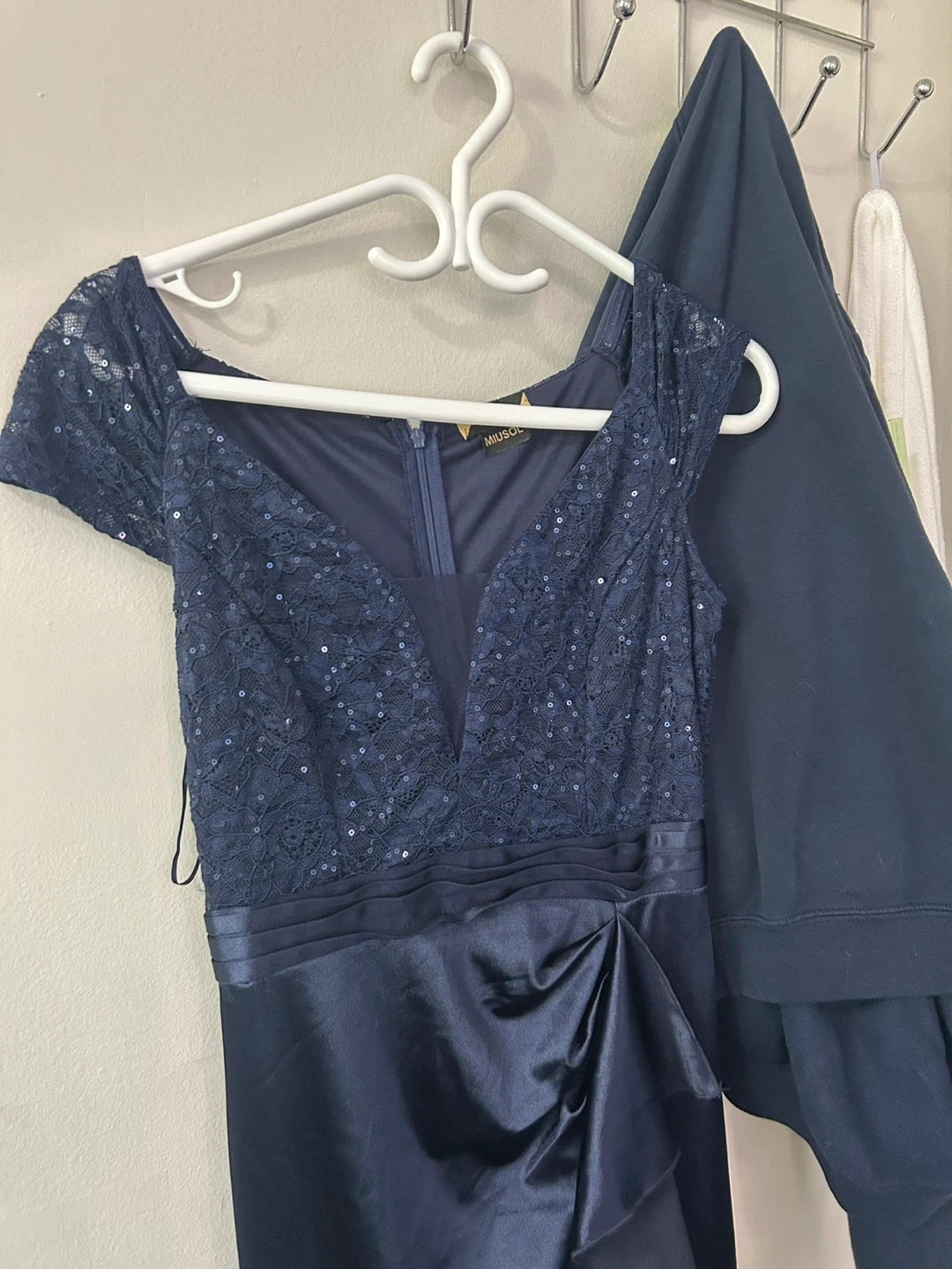 Selling a lovely navy blue dress from Miusol! It's a size small and features a beautiful design with sequins and a satin-like material on the lower part of the dress