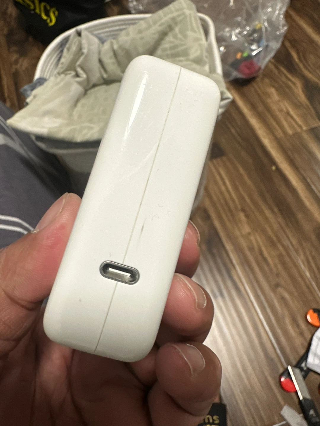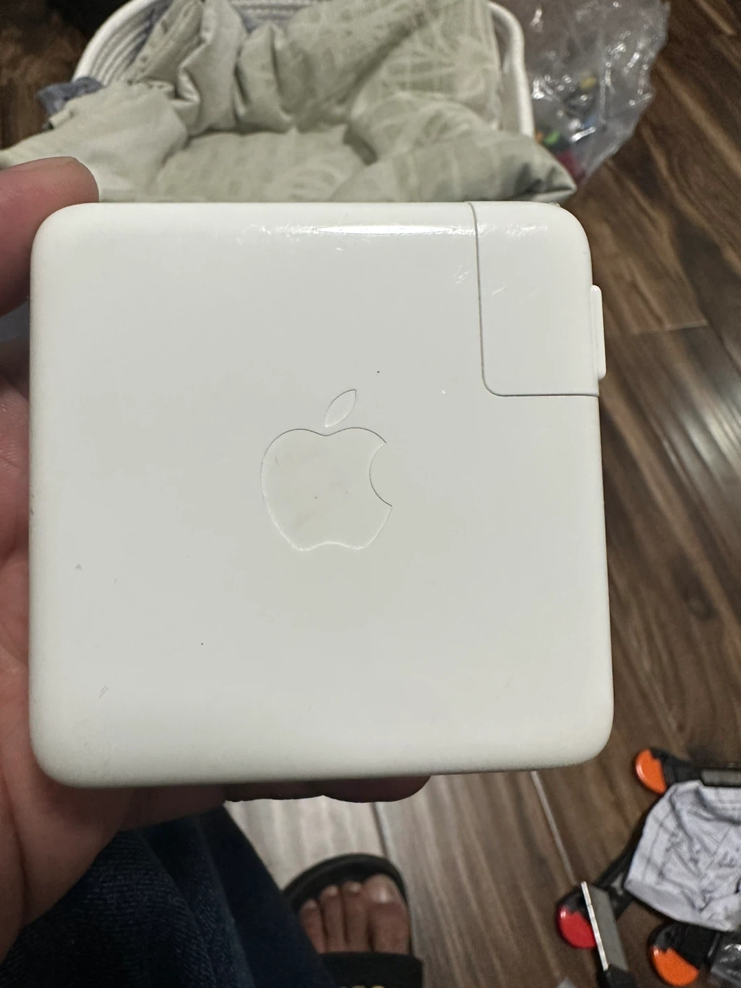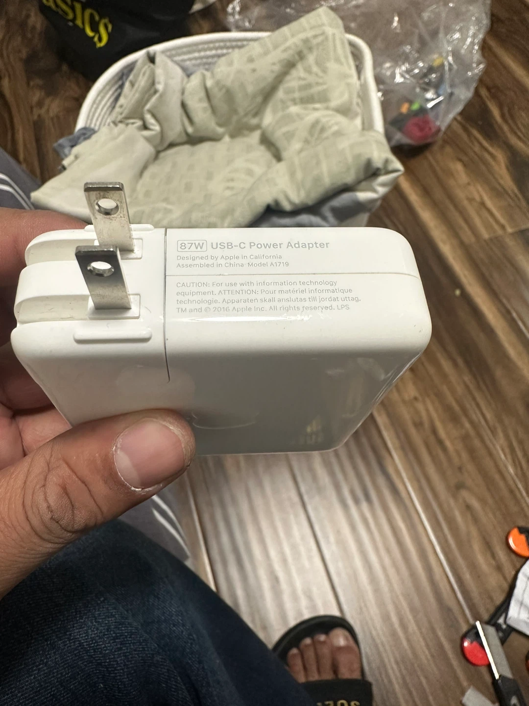 Selling an Apple 87W USB-C Power Adapter. It's designed by Apple in California and assembled in China, model A1719. There are some visible scratches.
