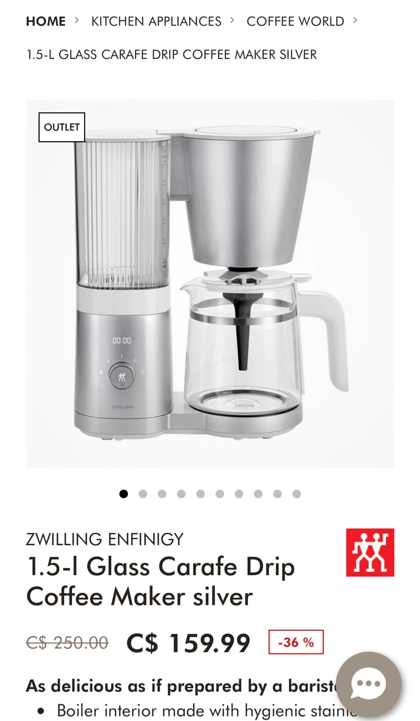 Selling a Zwilling Enfinigy 1.5-L Glass Carafe Drip Coffee Maker in silver! It makes coffee that tastes as delicious as if prepared by a barista. The boiler interior is made with hygienic stainless steel. Originally bought for $250.00